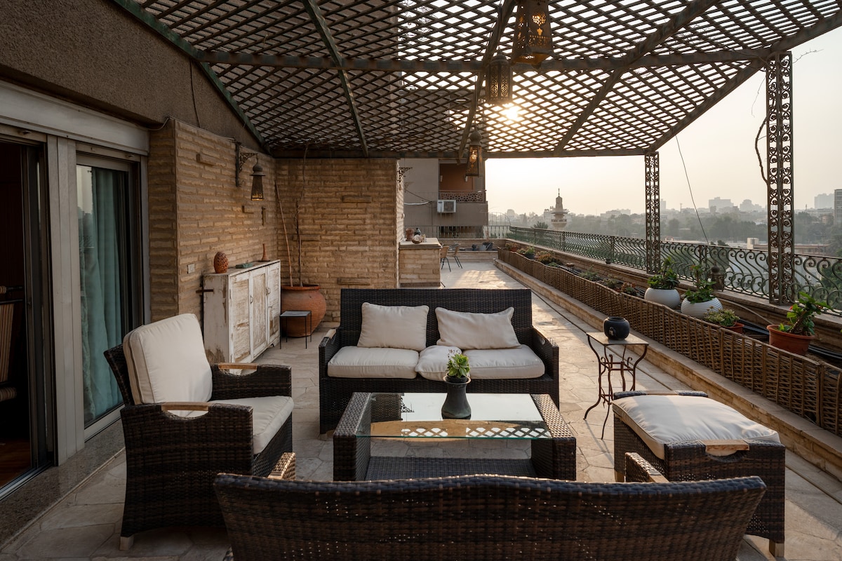 Despierta con la impresionante vista de las antiguas pirámides de Abusir justo delante de ti. Impresionante villa de 5 dormitorios con casa de huéspedes, piscina, exuberante jardín, gimnasio, sala de juegos y casa del árbol. Capacidad para 10 personas. Diseñado por el galardonado arquitecto Ahmad Hamid (Premio Mundial de Arquitectura 2010), inspirado en Hassan Fathy. A 20 minutos de las pirámides de Guiza y el Gran Museo Egipcio. Colección de arte seleccionada personalmente por la propietaria Taya Elzayadi. Chef privado disponible para contratar. Un refugio familiar tranquilo donde se unen la historia, el arte y el lujo.