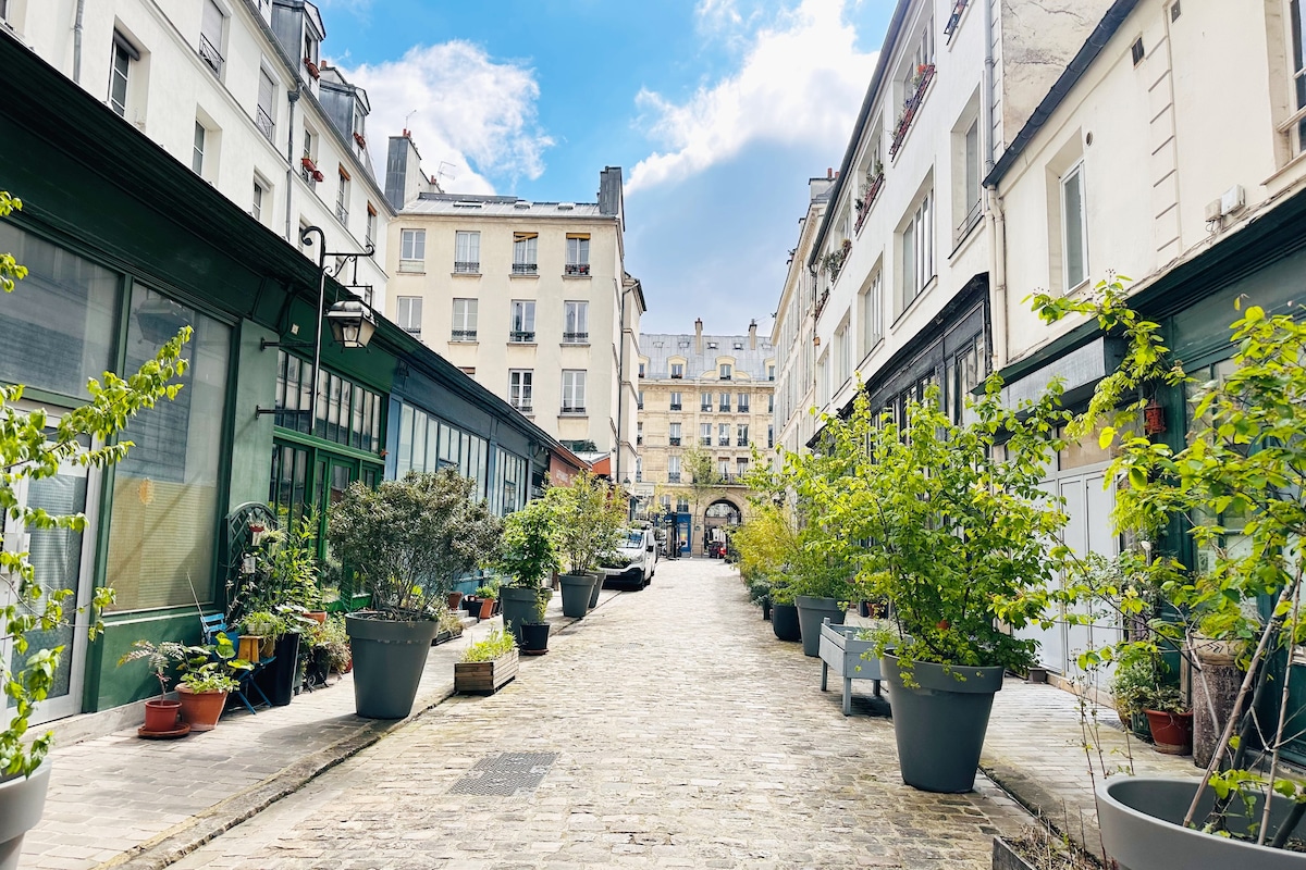 Con suelos de parquet en espiga, muebles finos y abundante luz natural, este sofisticado apartamento de 110 m2 ofrece un ambiente luminoso, elegante, cálido y lujoso. El apartamento, con chimenea y molduras, que combina encanto, calma y comodidad, se encuentra en uno de los pasajes más antiguos del centro histórico de París. Este apartamento cuenta con licencia oficial de explotación de alojamiento turístico. Así que es perfectamente legal.
