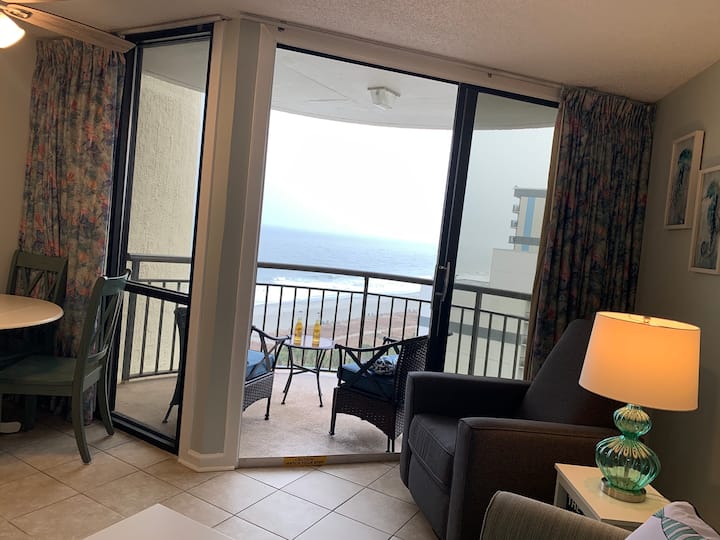 Condominio estilo hotel con vista al mar y balcón