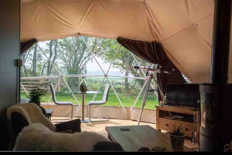 Esta cúpula glamping de lujo único está situada en un entorno tranquilo y hermoso sin vecinos cerca. Este suntuoso alojamiento independiente cuenta con todas las características de alta gama y pequeños extras encantadores que necesitas para una escapada romántica. Se encuentra en su propio entorno aislado y virgen, rodeado de naturaleza con impresionantes vistas. Disfruta del increíble baño de cobre profundo o sumérgete bajo las estrellas en el jacuzzi de leña. Excelente ubicación para observar las estrellas. Se proporciona madera.