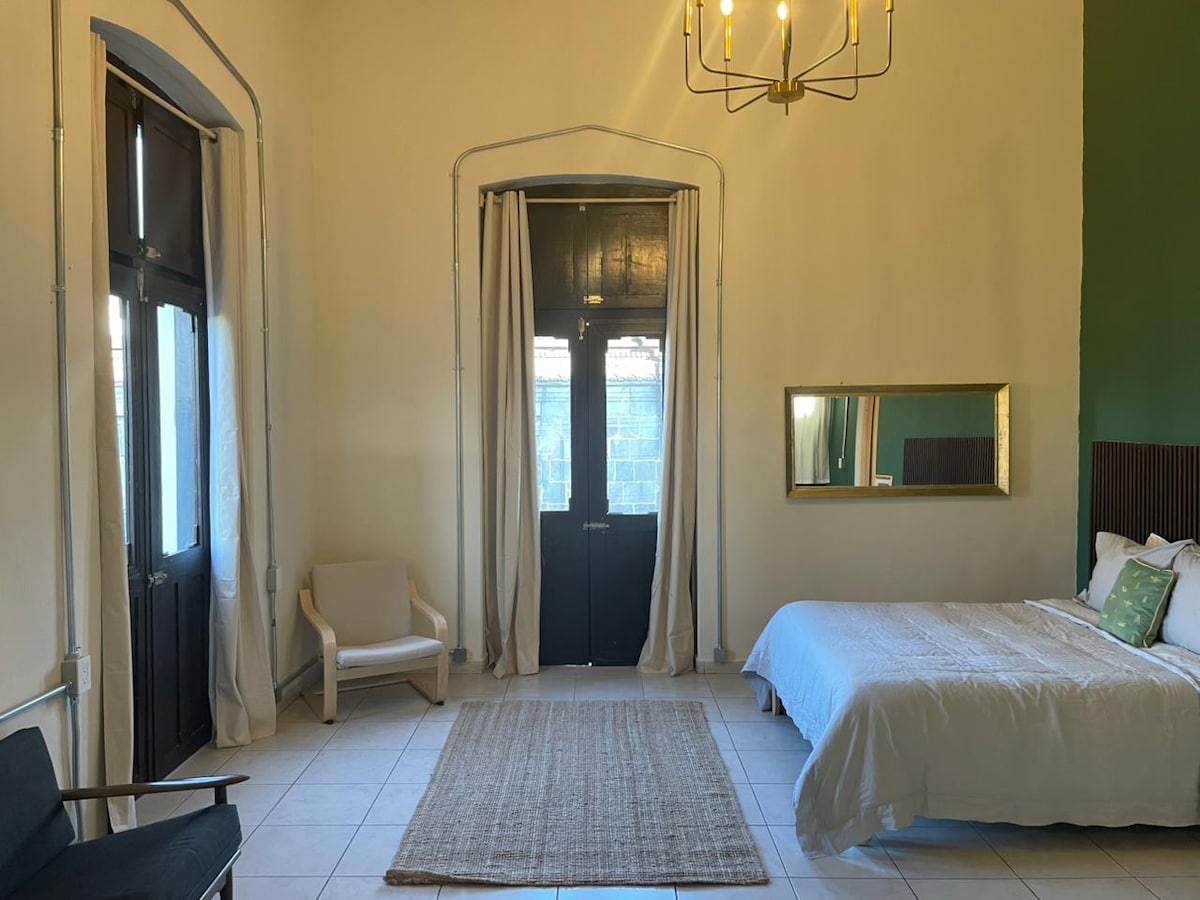 Justo en el área más bella y segura de la ciudad, ubicada dentro un histórico edificio colonial, se encuentra esta linda habitación, ideal para quien busca descanso, comodidad y limpieza. La habitación recién remodelada es amplia y fresca, cómoda cama queen size, bien iluminada, baño propio y regadera amplia. La ubicación es perfecta y segura para salir a pasear porque tienes lo mejor de la ciudad a unos cuantos metros; museos, iglesias, mercados, cafés, restaurantes, bancos, farmacias, etc.