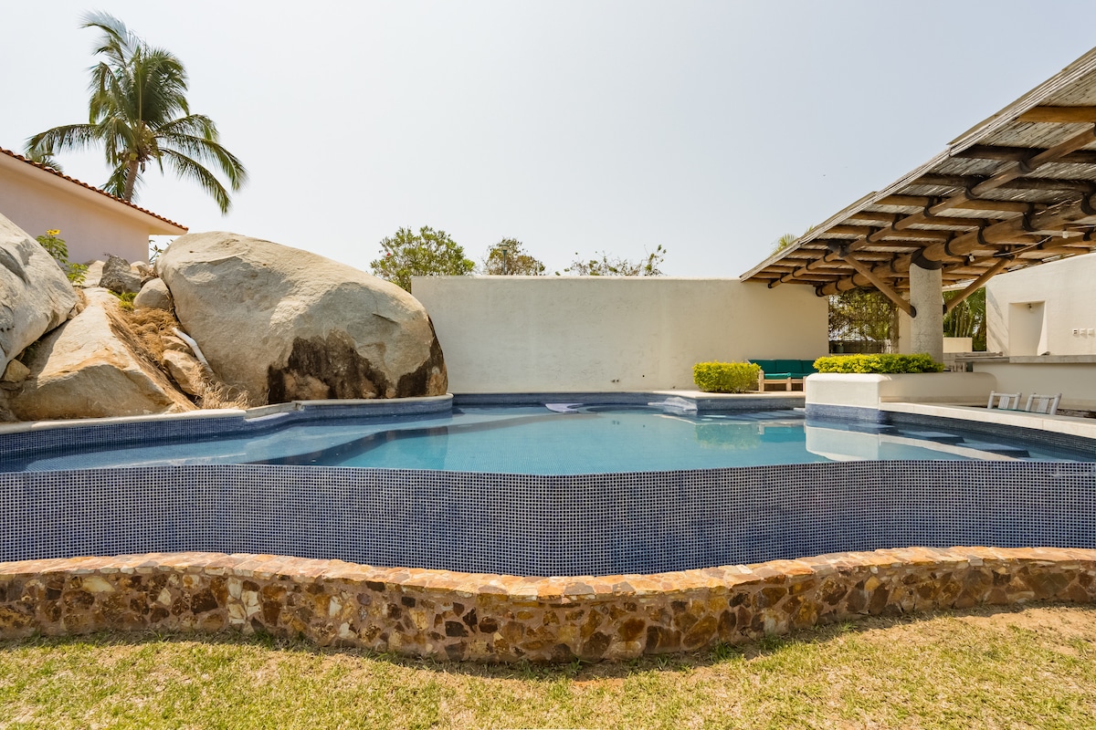 Totalmente renovada después de Otis: hermosa villa blanca en estilo relajado, de playa con detalles artesanales mexicanos. Piscina privada, 3 dormitorios con aire acondicionado, 2 estudios, sala de estar y comedor, todos con vistas completas al océano Pacífico. Llegada en auto muy recomendable, 2 lugares de estacionamiento disponibles. Casa club con una gran piscina, sauna y gimnasio. Limpieza incluida, servicio de cocina disponible a pedido. Seguridad las 24 horas. Sendero para correr/caminar disponible a través de Brisas, con vistas a la bahía de Acapulco.