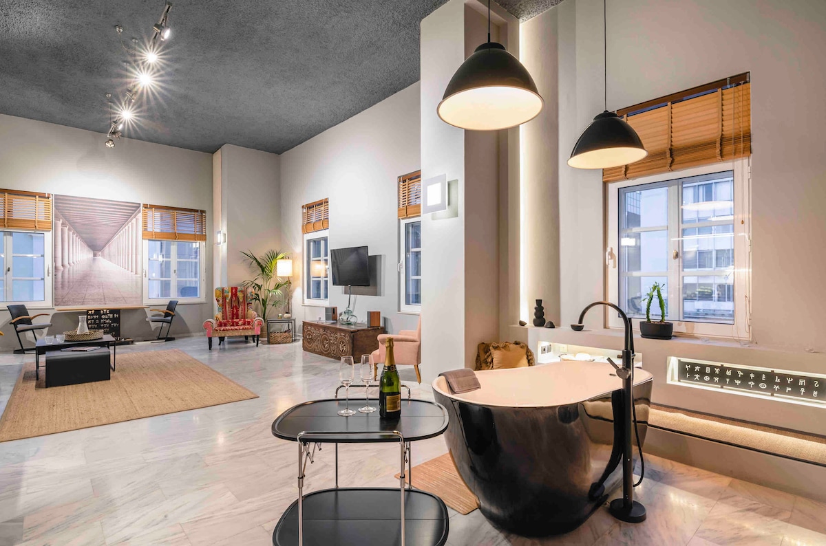 Under the Acropolis, a spacious (120 sq.m.) fully renovated loft with a free-standing bath tub, on the 2nd floor of a 19th century classical mansion in the heart of Athens! Located on Ermou street- pedestrian only street- is the most famous shopping hub of Athens! A luxurious loft with all the amenities of a proper home awaits to accommodate you and provide you with a hosting experience while living in the city’s rhythm! It suits business, leisure travellers or families & friends. Sleeps upto4!