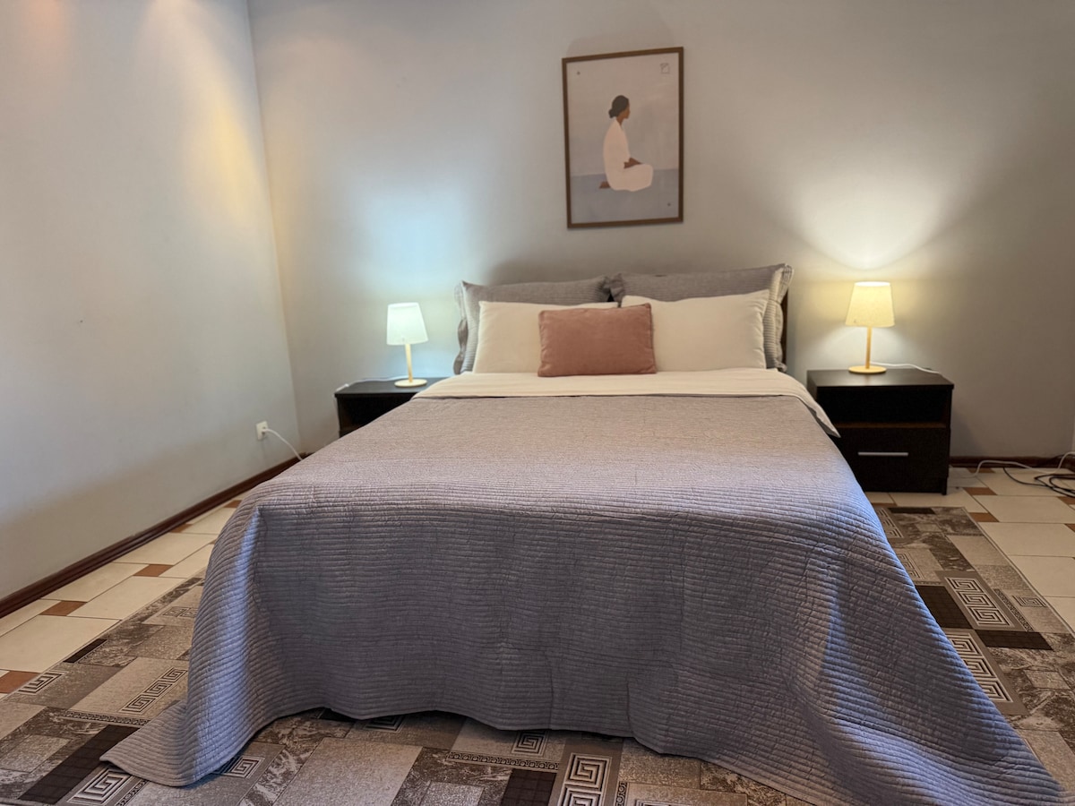 Parte élite y separada de la casa, con armario, aseo y baño. Tiene entrada independiente desde el jardín. El jardín tiene zona de césped verde, piscina, cenador con barbacoa y aparcamiento. También hay acceso a la cocina. Aparcamiento gratuito incluido.