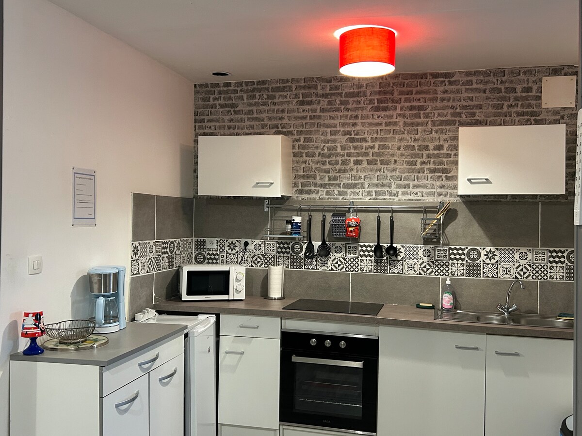 Relájese en este alojamiento tranquilo y elegante de tipo F3. Centro de la ciudad. Apartamento en el segundo piso escalera de 45 m2 que consta de 4 habitaciones, una hermosa sala de estar con sofá, Tv cocina equipada para cocinar según lo desee, 2 dormitorios cama 140 X 200, 1 habitación con ducha lavabo 1 inodoro. Lavadora en el pasillo disponible. Se proporciona la opción de lencería ( sábanas, fundas, toallas) incluida. A 50 m del centro de la ciudad, existe un patio para su vehículo.
