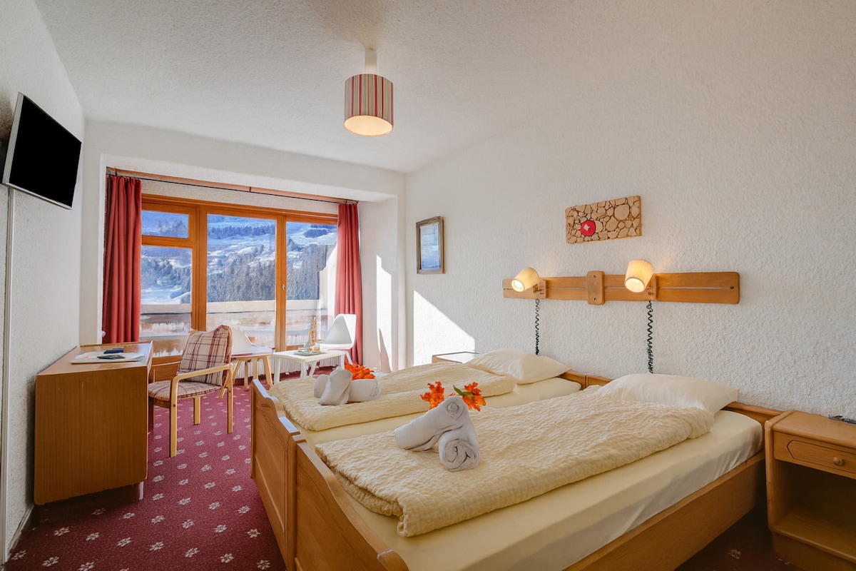 Découvrez une chambre confortable et lumineuse avec salle de bain privée, offrant une vue sur les Alpes vaudoises à Leysin. Idéalement située, la chambre bénéficie d’un emplacement privilégié : l’arrêt de bus se trouve juste devant la porte, un parking public disponible à côté de l’hôtel, et vous aurez un accès immédiat aux supermarchés, boulangeries et aux restaurants les plus populaires de la commune. Un cadre parfait pour profiter à la fois de la nature alpine et de la commodité du centre.