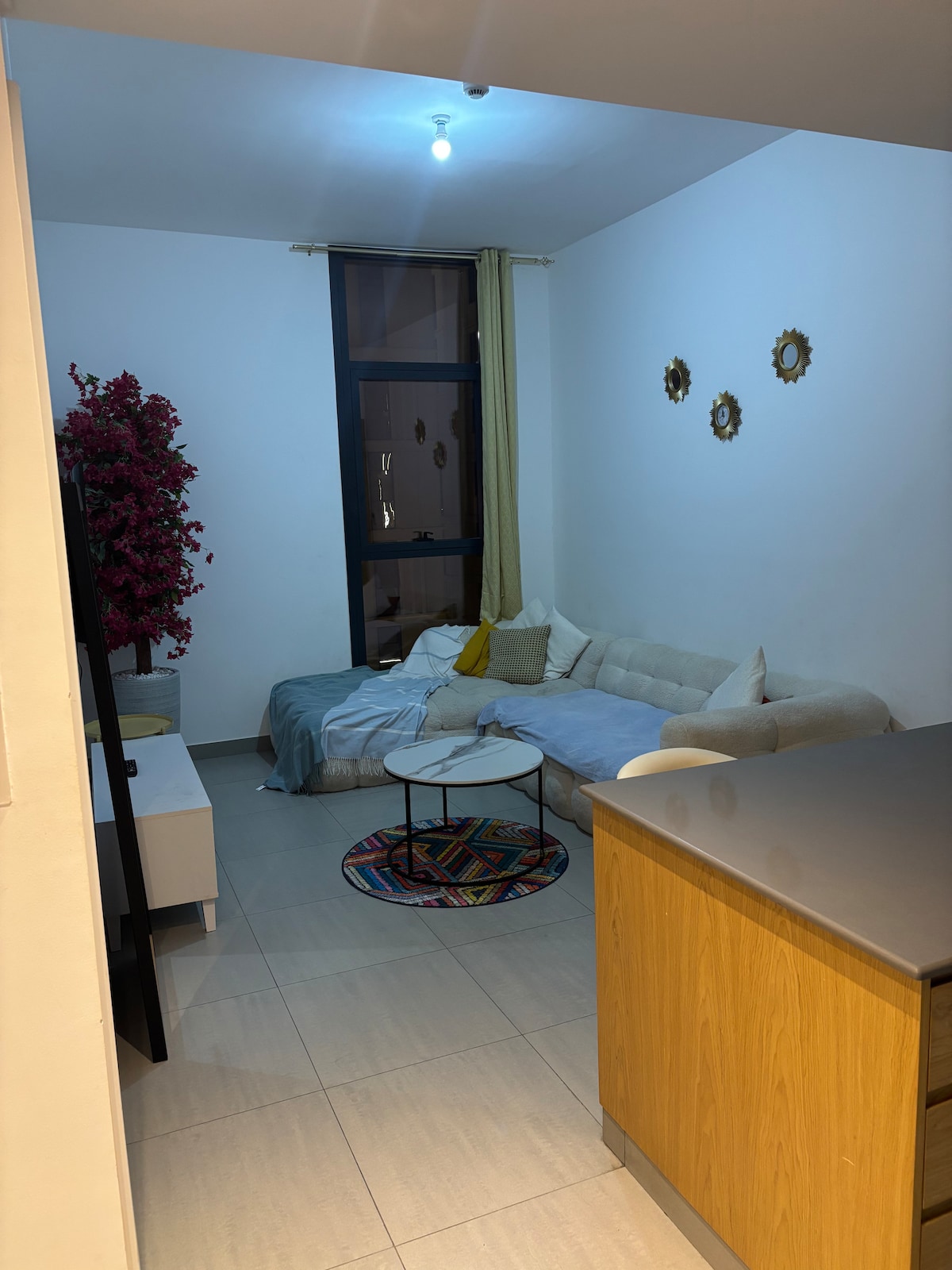 🏡 Acogedor apartamento de un dormitorio en Al Jada ¡Te damos la bienvenida a tu hogar lejos de casa! Este elegante apartamento de un dormitorio es perfecto para parejas, viajeros solitarios. ✨ Lo que te encantará del espacio: • Dormitorio con una cómoda cama, espacio de almacenamiento y TV de pantalla plana. • Sala de estar con sofá cama y un segundo televisor, perfecto para relajantes noches de cine. • Cocina totalmente equipada: cocina tus comidas favoritas con facilidad. • Un baño + inodoro separado para mayor comodidad.