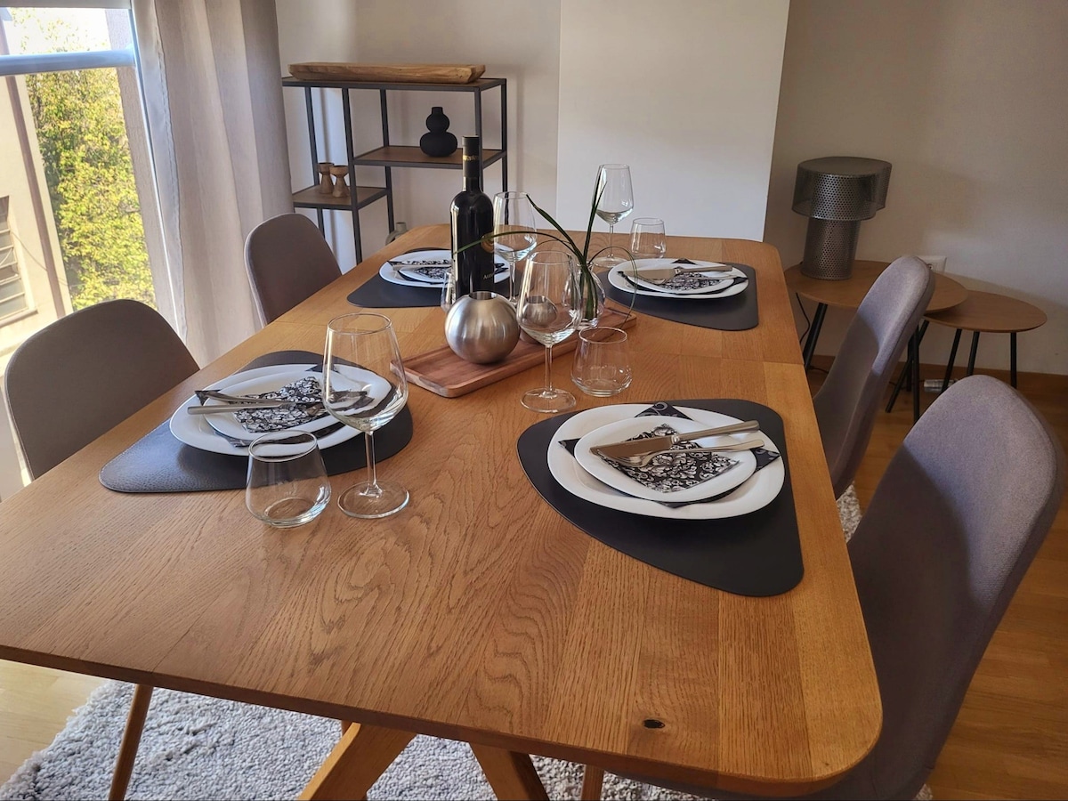 Disfruta de una experiencia de lujo en este céntrico alojamiento. Este es un apartamento NUEVO de 60 m2 a 5 minutos a pie del parque de la ciudad (estadio) y de la plaza principal. La mejor ubicación posible, muy cerca de las encantadoras calles de Debar Maalo con muchos bares y restaurantes. El apartamento tiene 1 dormitorio con cama tamaño queen y una sala de estar con un cómodo sofá cama + cama extraíble. También hay 2 balcones en ambas habitaciones, uno con vistas a la montaña Vodno. Puedes utilizarlo para tomar un café o almorzar.