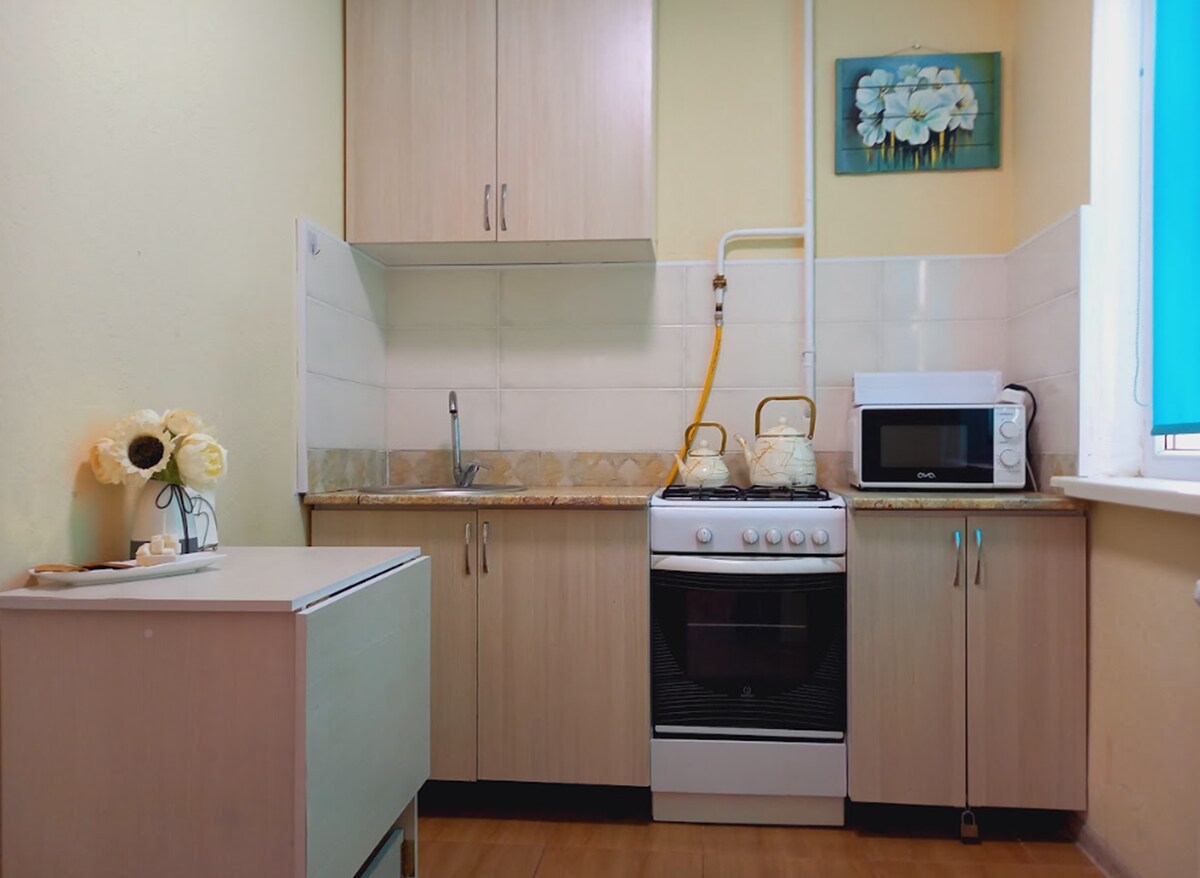 El departamento cuenta con todo lo que necesitas para una estancia cómoda y relajante. ¡Te sentirás como en casa con nosotros! Check-in a partir de las 2:00 p. m. Salida hasta las 12:00 h. Wifi Suscripción a SMART TV: MEGOGO + IVI Todos los electrodomésticos necesarios: estufa eléctrica, microondas, hervidor eléctrico, lavadora, nevera, plancha. Ropa de cama, toallas y pantuflas blancas como la nieve. Se instala una cerradura inteligente para el acceso 24/7. Un gran número de atracciones y varios lugares están a pocos pasos.