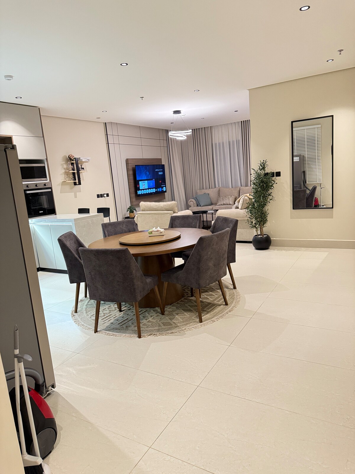 Apartamento elegante – Al-Khazama, Al-Khobar ✨ 🛏 3 dormitorios con ropa de cama de calidad hotelera 🛋 Amplia sala de estar + TV inteligente (Shahid VIP y Netflix) 🍳 Cocina totalmente equipada. Aire acondicionado❄️ central y dividido WiFi 🌐 de alta velocidad Entrada 🔑 inteligente | 🚗 Estacionamiento 📍 Ubicación privilegiada cerca de la calzada de Baréin, Corniche y centros comerciales ✨ Perfecto para familias y personas que buscan comodidad