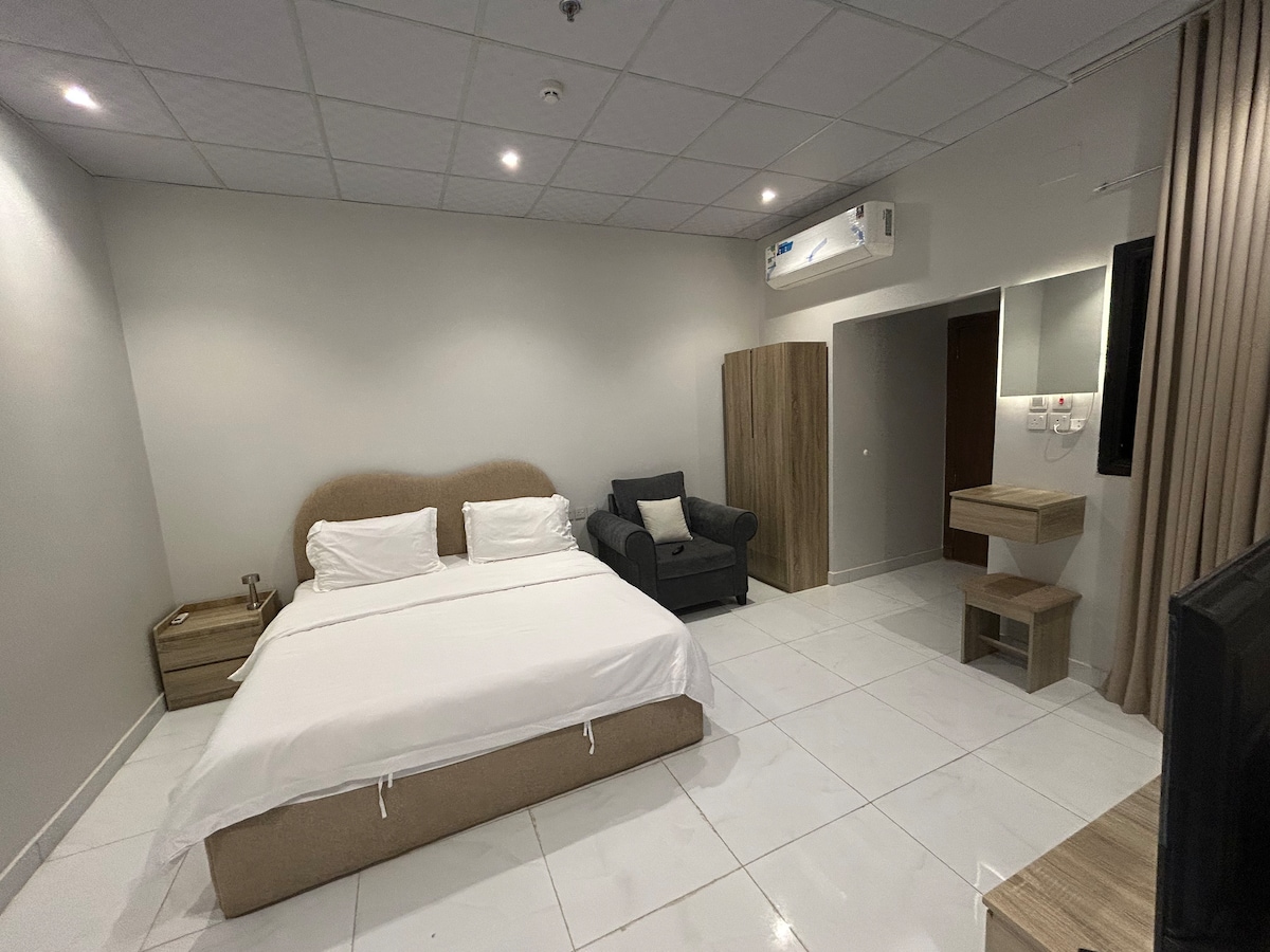 - El estudio es amplio y cómodo. - El apartamento está en la planta baja. - El apartamento tiene wifi de hasta 100 megas por minuto. - El apartamento está a 9 minutos en coche de la Gran Mezquita de Medina, a 4 kilómetros. Taxi a través de (Uber+ Creeam+ Jeeny) Solo te costará 15-30 riales.(4-8 dólares americanos). - El apartamento está situado cerca de la calle Sultana, que es la calle más famosa de Medina, a solo 200 metros encontrarás todo lo que necesitas Farmacias Restaurantes Cafeterías Compras Nos aseguraremos de atenderte durante todo el día para que tu estancia sea agradable y placentera.