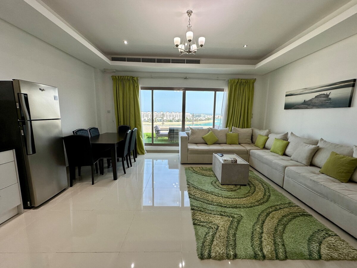 ¡Felicidad frente a la playa! Apartamento privado en un centro vacacional de 5 estrellas (la dirección de Bahréin) ¡Vive el sueño! Nuestra suite 1BR en un impresionante centro vacacional de playa ofrece una cama tamaño king, baño privado y una cocina abierta totalmente equipada. Relájate en el salón o en el patio compartido con vistas al jardín. ¡El centro vacacional cuenta con piscina, restaurantes, playa privada, spa, gimnasio, cafeterías y acceso al centro comercial Marassi Galleria! Estacionamiento gratuito, servicio de habitaciones las 24 horas, ¡tu oasis!