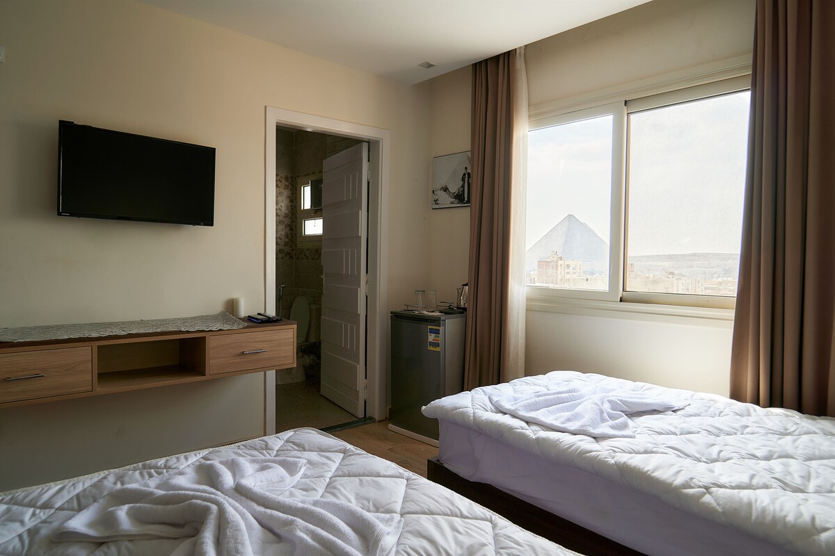 Experimenta la magia de Egipto desde nuestra habitación doble ejecutiva con: - Impresionantes vistas de las pirámides desde tu habitación. - Espaciosas y cómodas 2 camas dobles. - Almacenamiento conveniente del armario - Servicio de habitaciones profesional - Asistencia del personal las 24 horas del día, los 7 días de - Acceso ilimitado a la terraza en la azotea con vistas panorámicas a las pirámides (cierra a medianoche para pedidos de alimentos y bebidas). - Desayuno bufé con costo adicional. * organizamos excursiones bajo petición y conductores privados