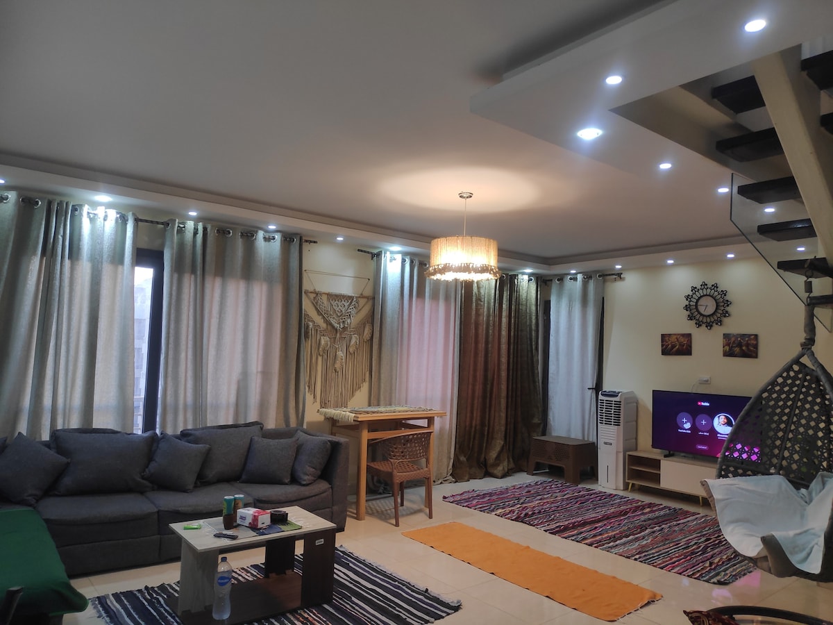 Disfruta de una estancia cómoda en este hermoso dúplex ubicado en el 5º asentamiento, Nueva El Cairo. La casa ofrece 4 amplios dormitorios y 3 baños, por lo que es ideal para familias y grupos. Cuenta con luminosas áreas de estar y comedor con luz natural y un diseño práctico y acogedor. El dúplex está en una ubicación privilegiada cerca de las carreteras principales, zonas comerciales, cafés, escuelas y servicios diarios, lo que brinda a los huéspedes un fácil acceso a todo lo que necesitan para una estancia relajada y cómoda.