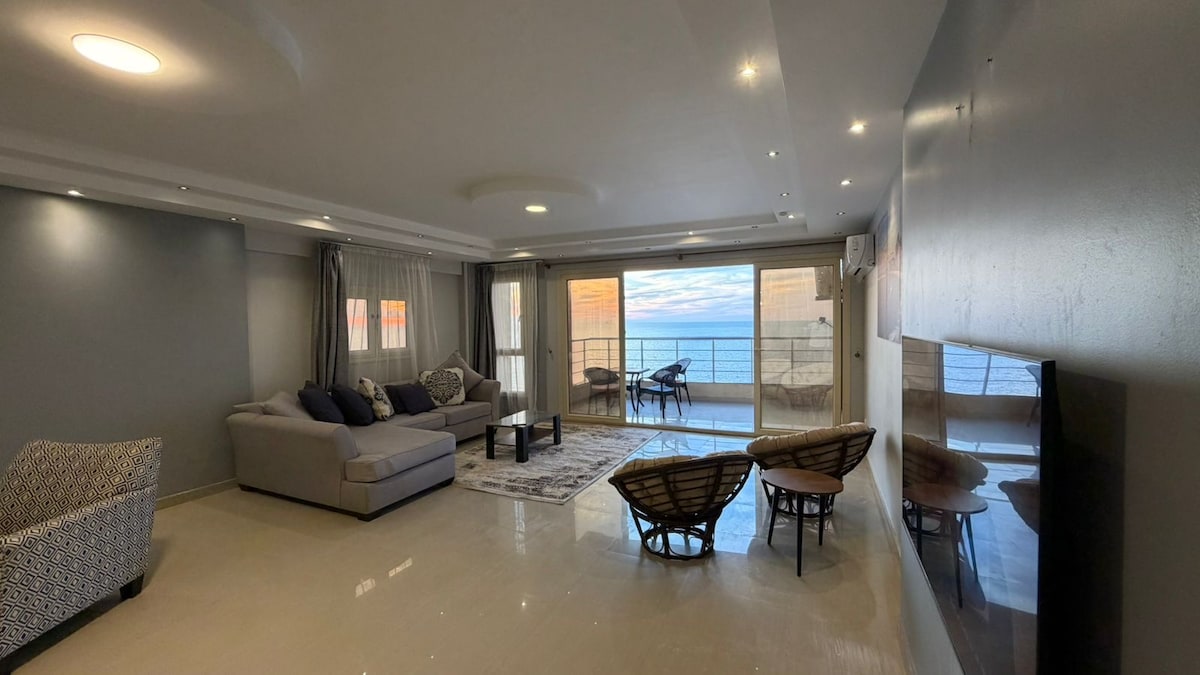 🏖️ Luxurious Beachfront Apartment in Gleam, Alexandria | Unforgettable Getaway! ✔️ Panoramic Sea Views: Wake up to waves & breathtaking vistas ! ✔️ Elegant Design: AC/heating in cozy bedrooms, stylish living room, modern kitchen . ✔️ Endless Entertainment: 55" Smart TV with Netflix & Shahid VIP + high-speed Wi-Fi. ✔️ Security: 24/7 , elevators. 📍 Prime Location: Steps from the beach 🌊 – swim or stroll at sunset! Gleam’s top restaurants/cafes ☕ Near Alexandria’s landmarks & shopping.ه