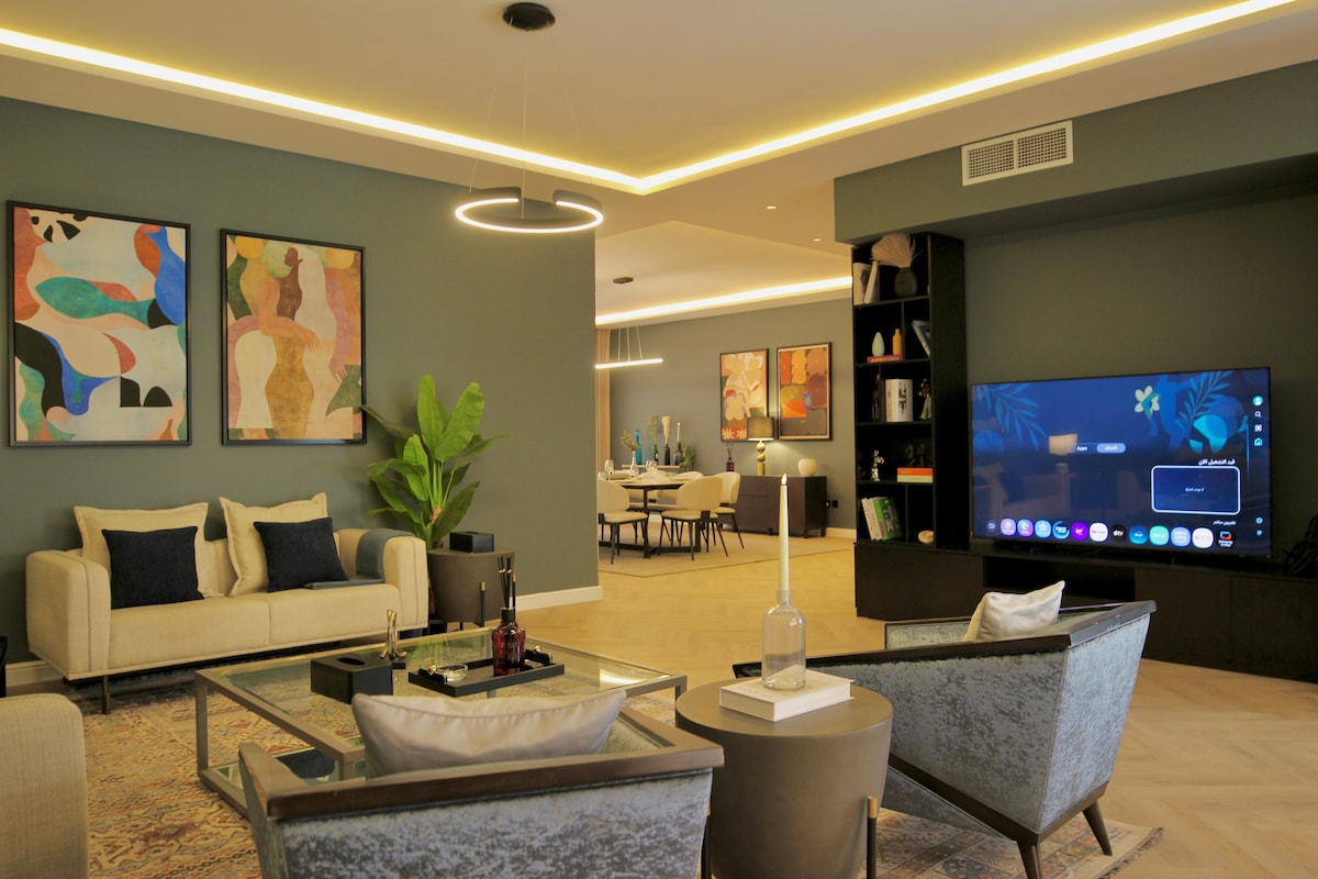 Bienvenido a nuestro apartamento, que le ofrece una estancia excepcional que supera sus expectativas. El apartamento tiene un dormitorio equipado con los mejores colchones, además de un salón separado con cómodos sofás y una pantalla inteligente de 65 pulgadas para disfrutar (Netflix, Shahid, BeIN) + wifi. La cocina está totalmente equipada para satisfacer todas tus necesidades. Hay una zona exterior con un diseño rústico y una vista privilegiada del centro financiero, ideal para celebrar eventos y reuniones con familiares y amigos. El apartamento está equipado para estancias cortas y largas. La ubicación es fantástica, en el corazón de la ciudad, cerca de lugares de interés, servicios y restaurantes.