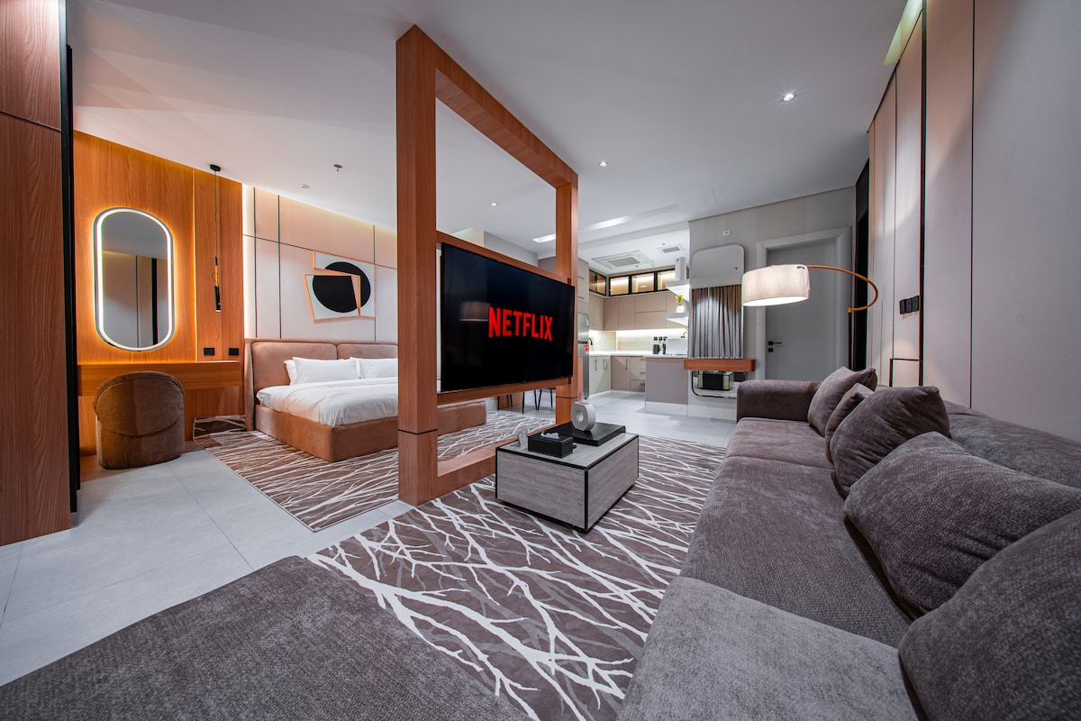 Este lugar único tiene un estilo propio, diseñado para ofrecer comodidad, elegancia y un toque de lujo. Cada habitación está cuidadosamente amueblada con una decoración elegante y acabados de alta gama. Disfruta de servicios de primera calidad que incluyen una experiencia de cine VIP, televisores de pantalla plana QLED, máquinas de té/café, secadores de pelo, toallas suaves y un paquete de bienvenida de cortesía. Ya sea que estés aquí para una escapada corta o una estancia más larga, te sentirás como en casa con nuestras comodidades modernas y toques personalizados.