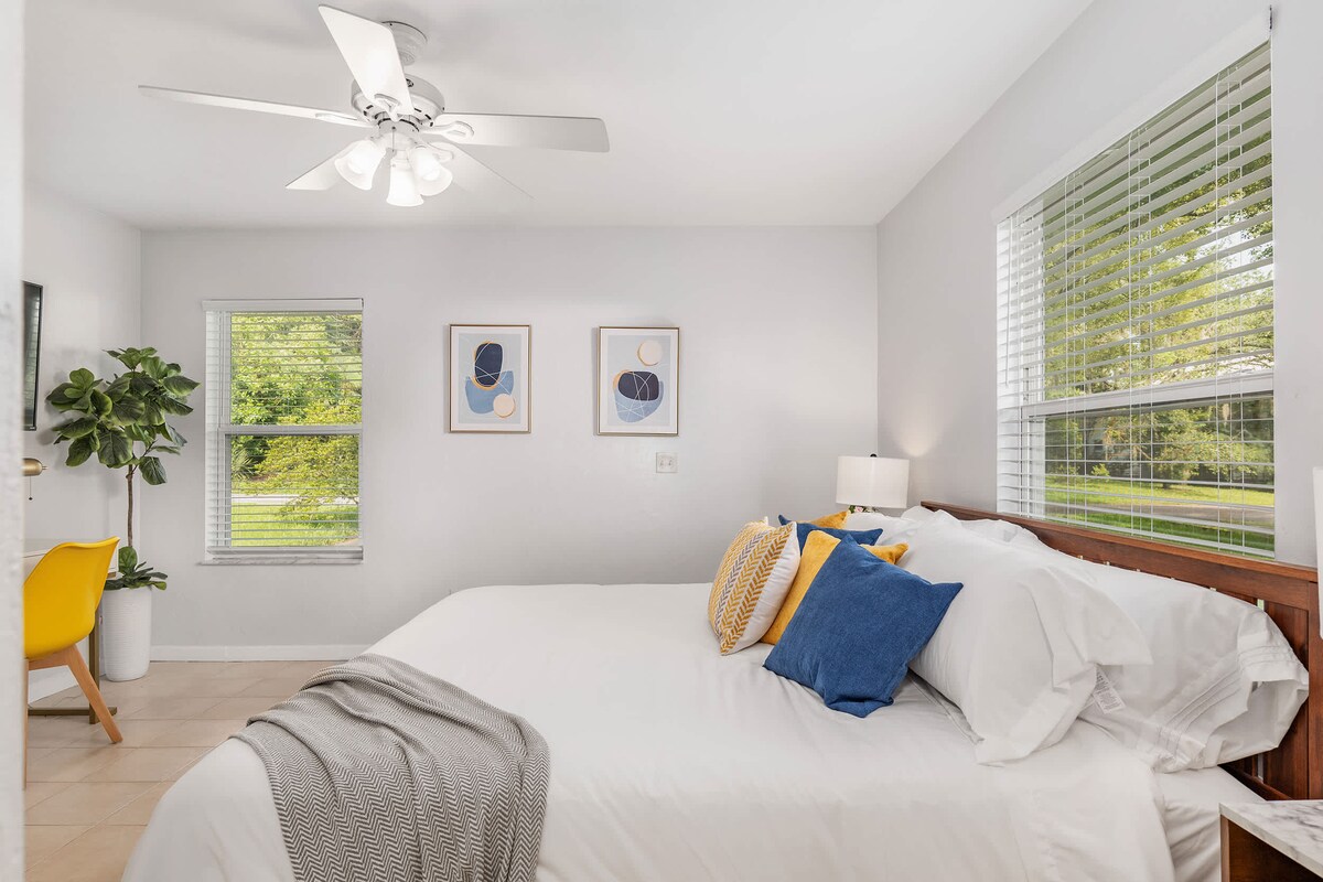 NEWLY RENOVATED - Enjoy your Gainesville stay in this mid-century modern studio 0.5 miles from UF and 2 miles from UF and HCA hospitals. No detail was overlooked in this beautifully designed detached guest house with an abundance of natural light, upscale finishes, and endless amenities - kitchenette, mini fridge/freezer, smart TV, and more! This conveniently located private and quiet space in the heart of Gainesville is perfect for anyone visiting for just one night or a few weeks.