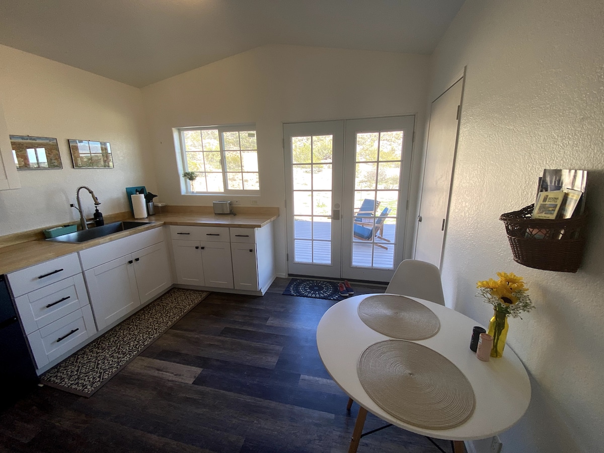 Bienvenido a nuestra suite de invitados en la ladera de una colina en el valle de Verde, cerca de las rocas rojas de Sedona y rutas de senderismo panorámicas. Este acogedor refugio, adyacente a la casa principal, es una suite privada y ofrece una entrada privada y terraza. Relájate en un espacio elegante con una cama tamaño queen, zona de estar, TV, wifi, espacio de trabajo, mininevera, microondas y cafetera, baño privado con bañera y ducha. Disfruta de unas vistas impresionantes desde la terraza con una infusión matutina. Explora Sedona, Jerome y los viñedos locales. ¡Tu estancia inolvidable te espera!