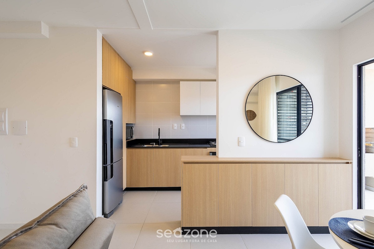 Amplo Loft de conceito aberto de 70m2, com vista para natureza, montanhas e mata, localizado em andar alto, proporcionando tranquilidade, privacidade em condomínio de lazer completo a 05 minutos de carro até o mar da praia brava. O apartamento dispõe de cama king size e sofá-cama, capacidade para até 4 pessoas. Atende perfeitamente casais, famílias, viajantes e profissionais em home office. A localização permite alternar entre mar, calma e o agito que a Praia Brava e BC podem oferecer.