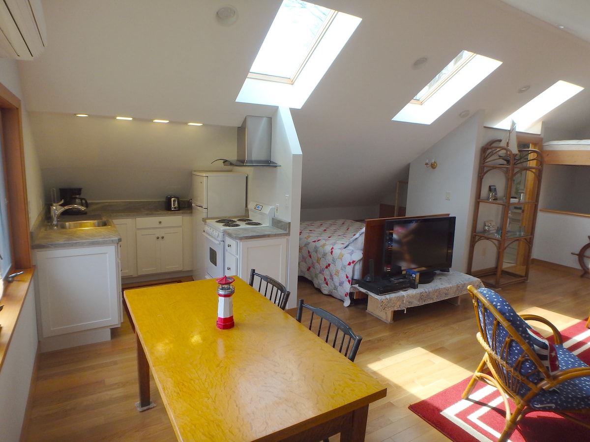 The 600 Sq. Ft Studio with skylights has a sitting area with sofa-bed, flat screen TV/DVD, sleep area with queen-size bed, dining area, fully equipped kitchen and full bath with shower. Views overlook a 30 acre farm (south) and mountains (east). The studio is in a separate building with a private entrance. The 4 acre property includes perennial and vegetable gardens, an orchard and walking paths. The studio is easily accessible to biking, hiking, swimming, and numerous cultural attractions.