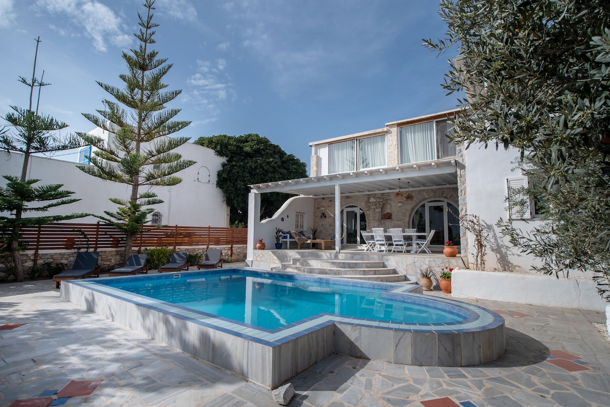 Villa tradicional de estilo cicládico con piscina en el pueblo de Aliki. Se encuentra a 500 metros del centro de Aliki con sus restaurantes, cafeterías y la playa principal. Se encuentra en una zona rural tranquila, a 12 kilómetros de Parikia y a 2 kilómetros del aeropuerto de Paros. (Absolutamente sin ruido, los aviones no pasan sobre la casa). También está a 50 metros de una parada de autobús con conexiones frecuentes al aeropuerto y a la capital y a 2 kilómetros de la popular playa de Faragas.
