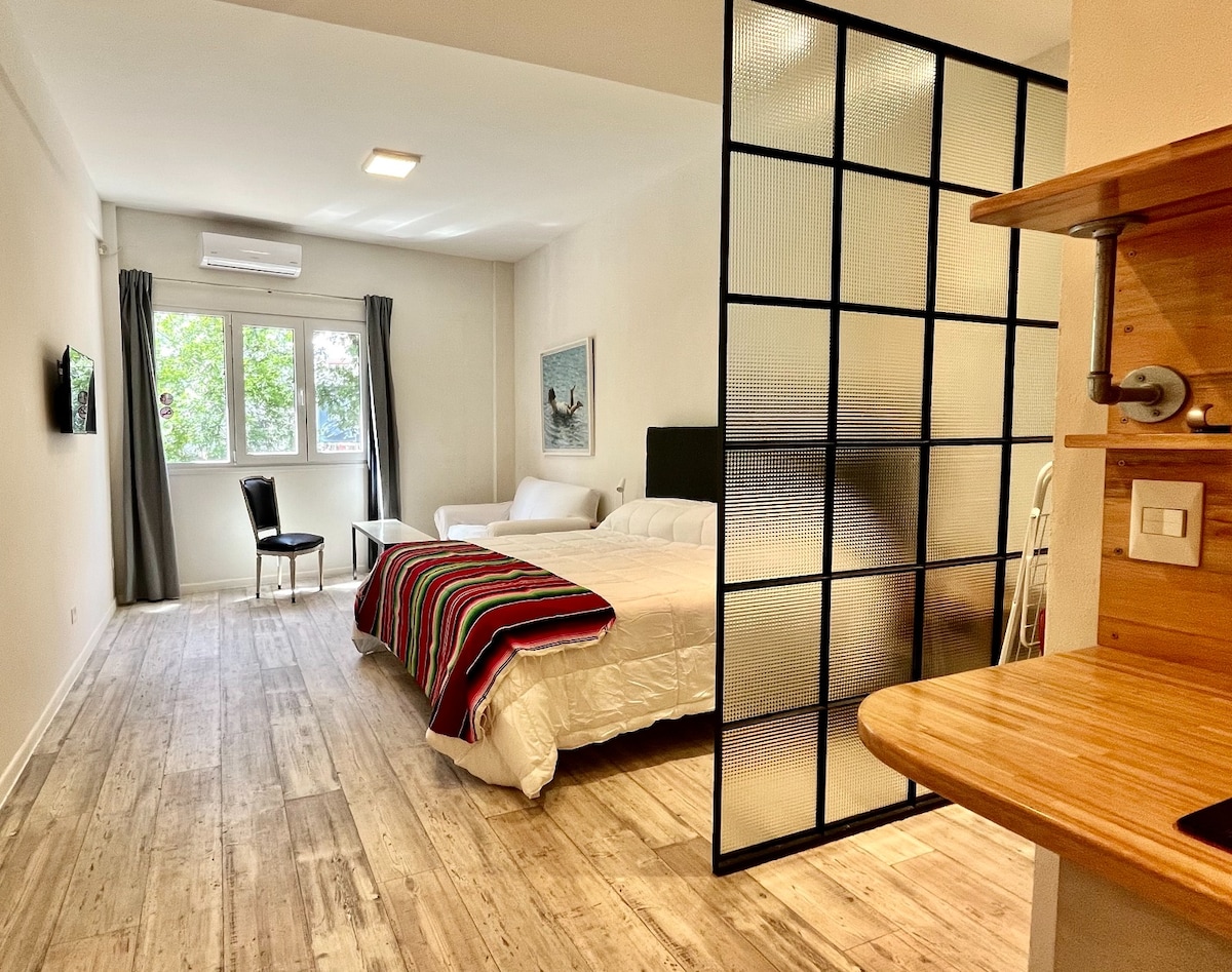 Amplio monoambiente, con cocina separada, totalmente remodelado con todo el estilo y las comodidades en la mejor ubicación de Buenos Aires. Frente al Alto Palermo shopping, cerca de parques, principales avenidas y subte . Cama dos plazas, Smart TV, baño completo con bidet, ducha y secador de pelo, cocina con Heladera y Freezer, tostadora, cafetera y microondas con grill. Cortina blackout automáticas con control remoto. Aire acondicionado Frío Calor.