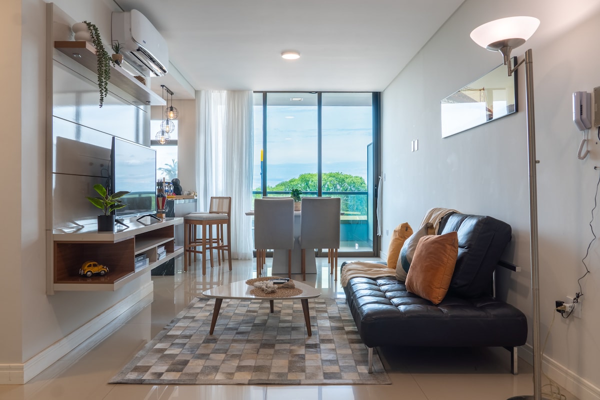 En un edificio que ofrece comodidades como piscina, gimnasio y terraza con vista panorámica. Ubicado en Ciudad del Este, una de las ciudades de mayor crecimiento en Paraguay, este moderno apartamento cuenta con un dormitorio, un baño, cocina equipada, una acogedora sala de estar con sofá cama y Smart TV, y un balcón privado con una impresionante vista de los alrededores.