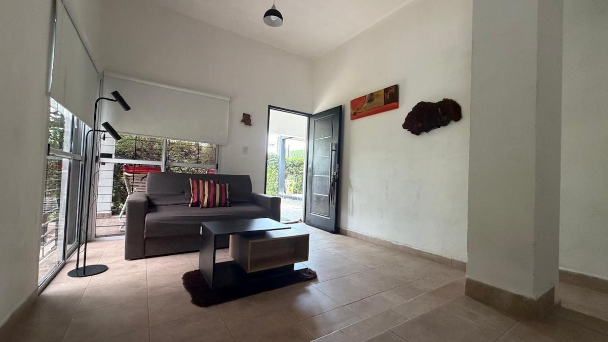Departamento moderno en El Rodeo con vista al Cristo y a las montañas. Cuenta con una habitación matrimonial y otra con dos camas individuales, baño completo, sala de estar, cocina equipada y balcón al este. Dispone de terraza, asador y un amplio patio verde al frente. Ideal para descansar y disfrutar del entorno natural.