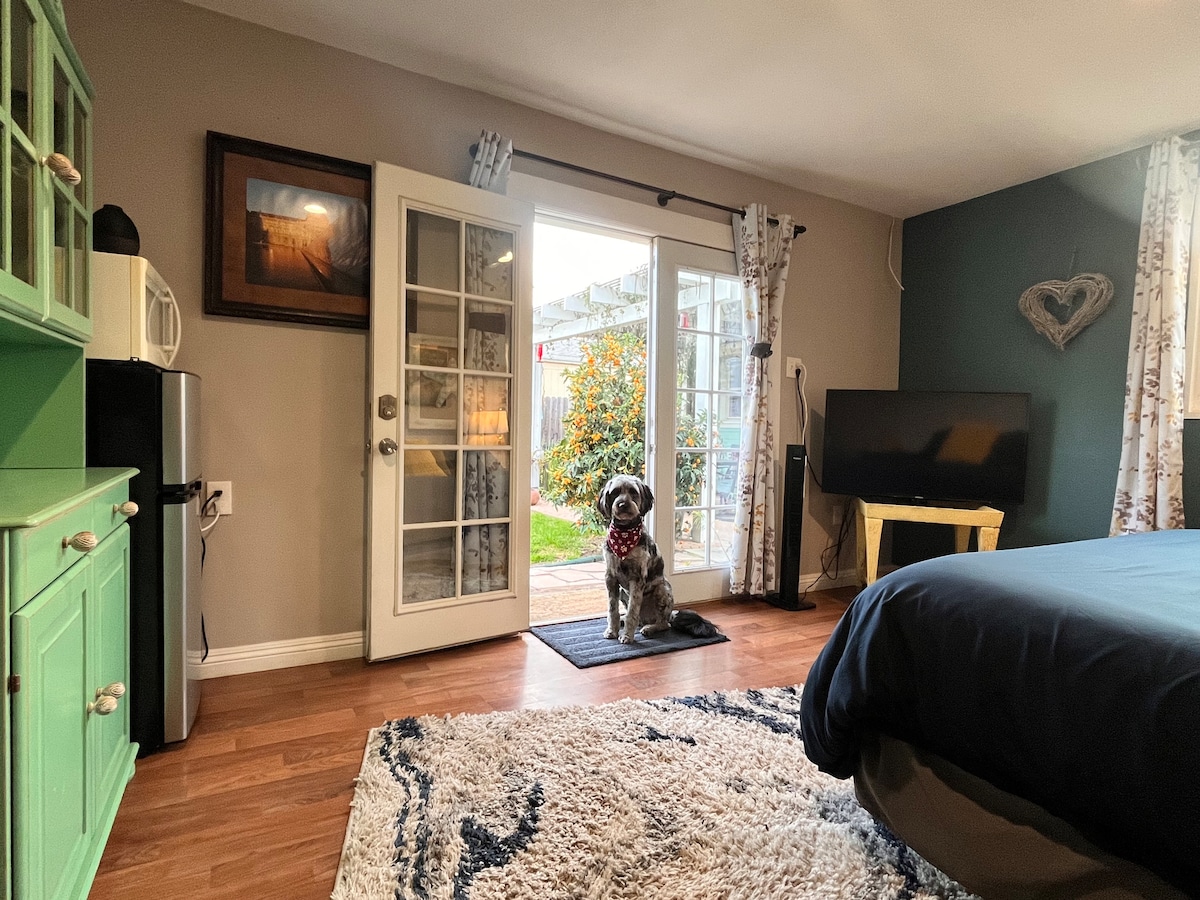 Acogedora pero espaciosa CASITA independiente para 2-3 huéspedes (3er huésped $39) Comparte nuestro relajante patio trasero único o camina hasta la animada "Plaza de Orange", una divertida zona de restaurantes/compras/antigüedades al aire libre en el casco antiguo de Orange. Estamos cerca de la Universidad Chapman, 2 centros comerciales, enchufes, parques, autopistas, el centro de convenciones Anaheim y el Honda Center. Disneyland se encuentra a 12 minutos en coche. Hay muchos estacionamientos gratuitos en la calle. Se permiten amigos, pero sin fiestas. De vez en cuando, es posible que 2 Dachsies pasen para decir ¡Hola!