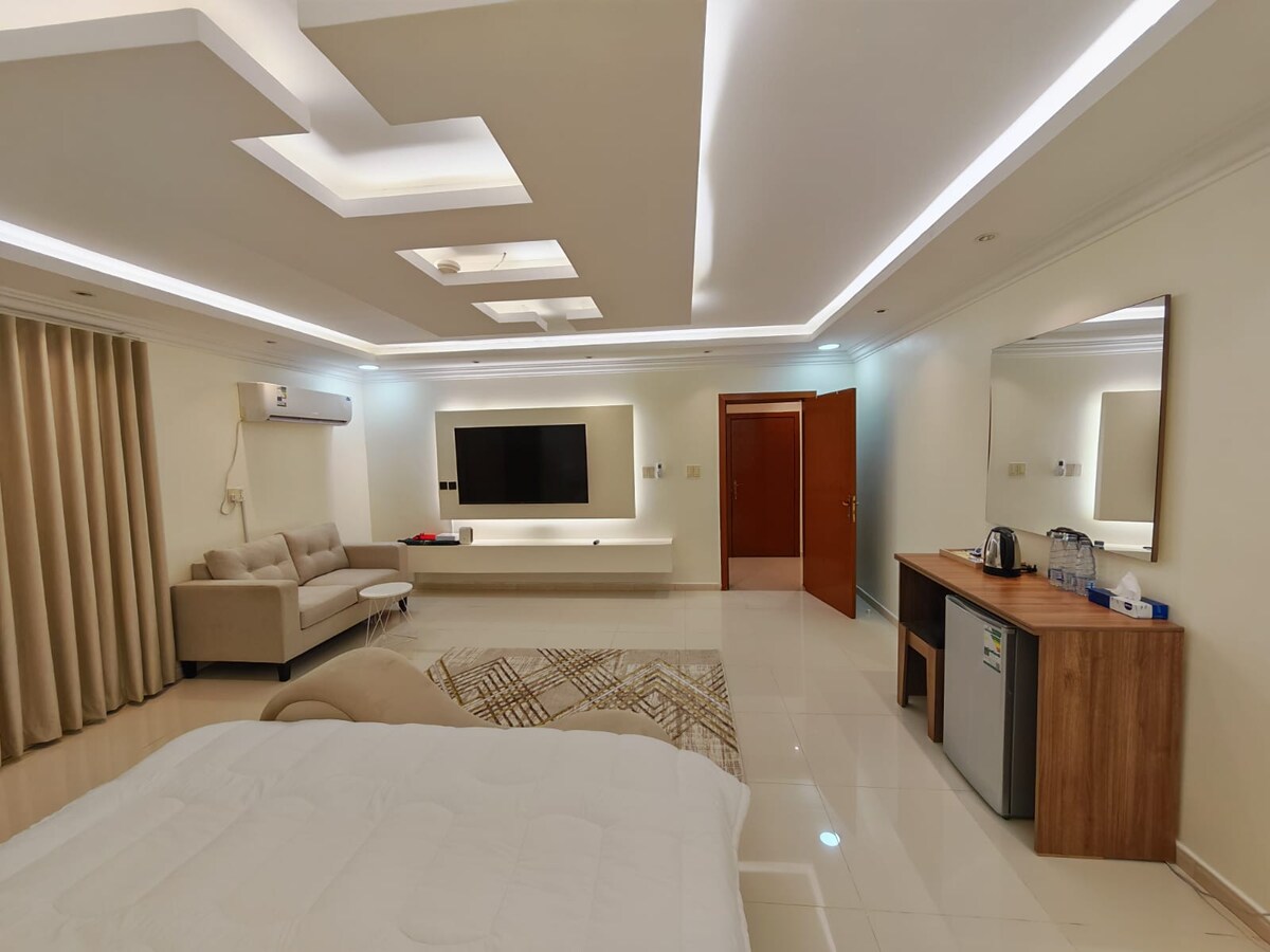 - Cómodo dormitorio: incluye una cómoda cama con sábanas suaves y un diseño cómodo que garantiza noches de sueño tranquilo. Con un televisor inteligente, puedes ver canales de televisión a través de Shahid VIP y vídeos en YouTube y Netflix. - Cocina equipada: contiene todas las instalaciones necesarias, incluyendo nevera y hervidor. - Baño limpio: el baño está equipado con todos los suministros necesarios. - Comodidades adicionales: las comodidades adicionales incluyen una plancha y un aislante acústico eficaz. - Acceso autónomo: las unidades están aseguradas con la función de acceso autónomo - Servicio de Internet: servicio de Internet rápido y seguro.