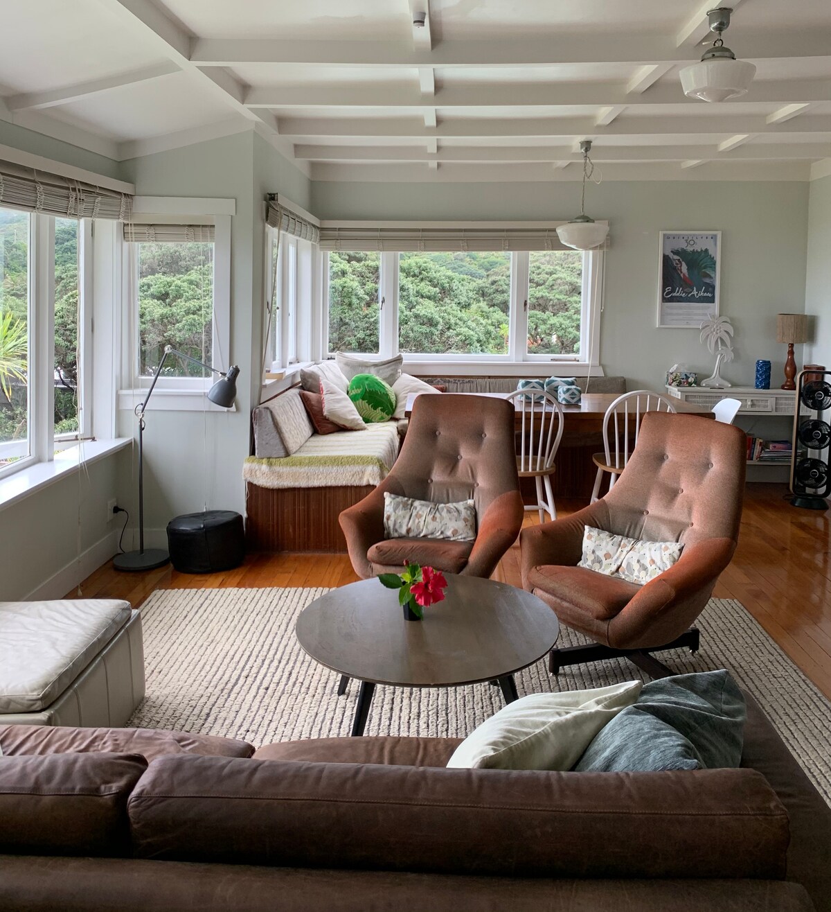 Lugar privilegiado al otro lado de la carretera de la espectacular playa de surf de Piha, en el tranquilo extremo norte. Grandes terrazas soleadas, maravillosa vida interior y exterior, enclavada entre hermosos pohutukawas, cómoda casa lejos de casa, cocina recientemente renovada, la mayoría de los servicios modernos, con un toque kiwi. Surfea al otro lado de la carretera, fácil acceso a la zona de patrulla de surf de North Piha para nadar; paseos, vino, juegos y libros junto al fuego en invierno. ¡Ve el surf desde tu almohada en la planta superior en el dormitorio principal!