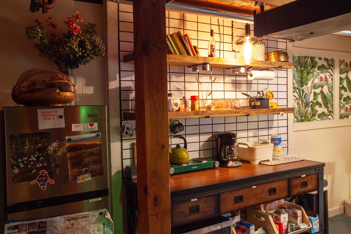 El nivel inferior de nuestra casa Jewel Lake con una entrada separada y un patio trasero divertido. Esta es una remodelación reciente; un espacio ecléctico con techos de madera vintage y una mezcla de detalles industriales y modernos. Estamos a 5 minutos en auto del aeropuerto y los huéspedes pueden disfrutar de la naturaleza salvaje de Alaska desde este espacio. Un sistema de senderos boscosos se encuentra justo detrás de nuestra casa para caminar y andar en bicicleta. Los huéspedes pueden recoger huevos de nuestras gallinas, usar nuestro jacuzzi junto al bosque, avivar el fogón o usar tablas de paddle en Sand Lake.
