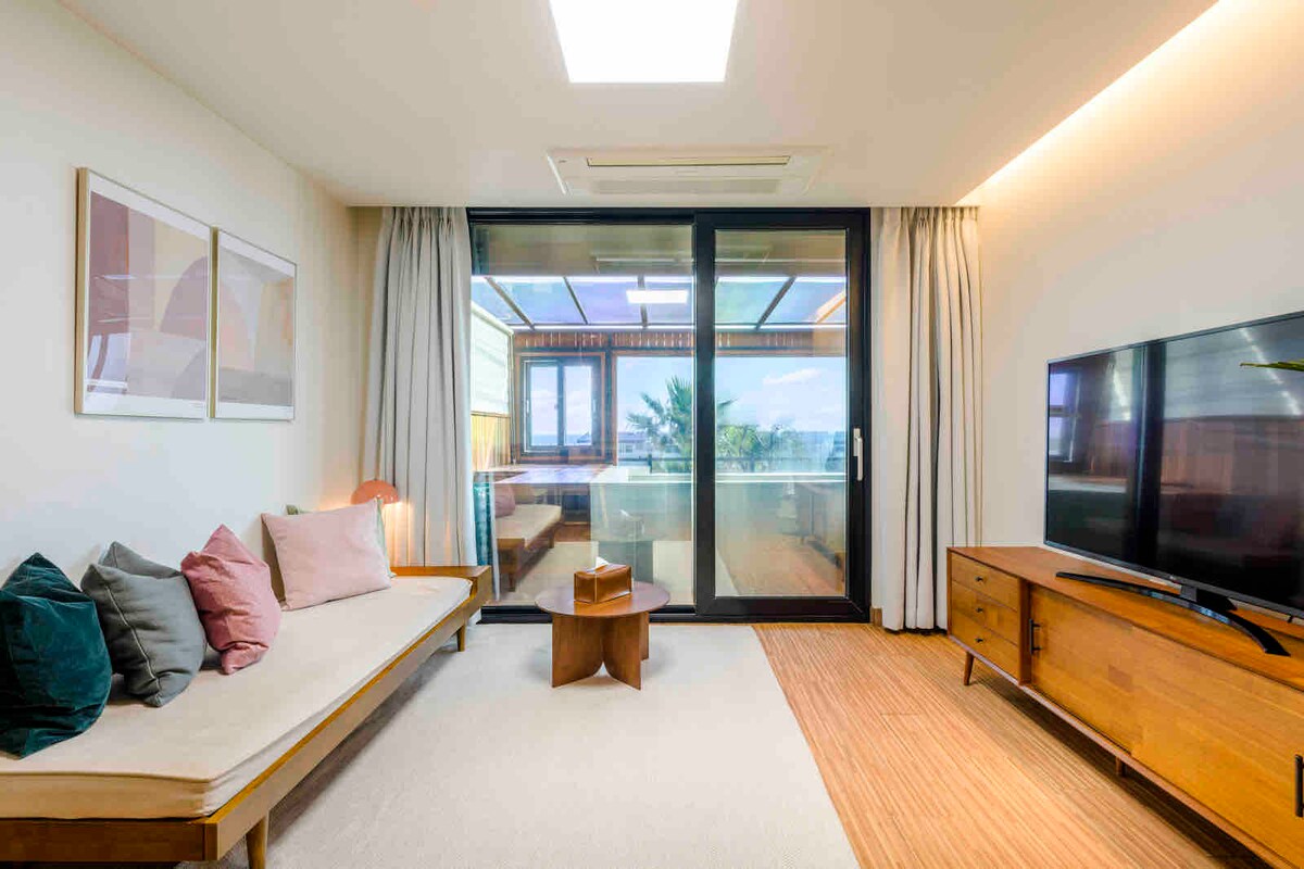 Hola. Ubicado sobre un acantilado en el centro de Seogwipo, este espacio ofrece vistas al océano y a las islas. Con 66㎡ garantiza privacidad y tiempo propio. Aunque es tipo estudio, el dormitorio, sala y cocina están claramente separados, brindando amplitud y comodidad. En la terraza podrá disfrutar del spa y de una barbacoa con vista al mar. Desayune frente al mar en la piscina infinita a diario. La piscina abre de mayo a octubre. El lounge ofrece desayuno gratuito con vistas a Beomseom.:)