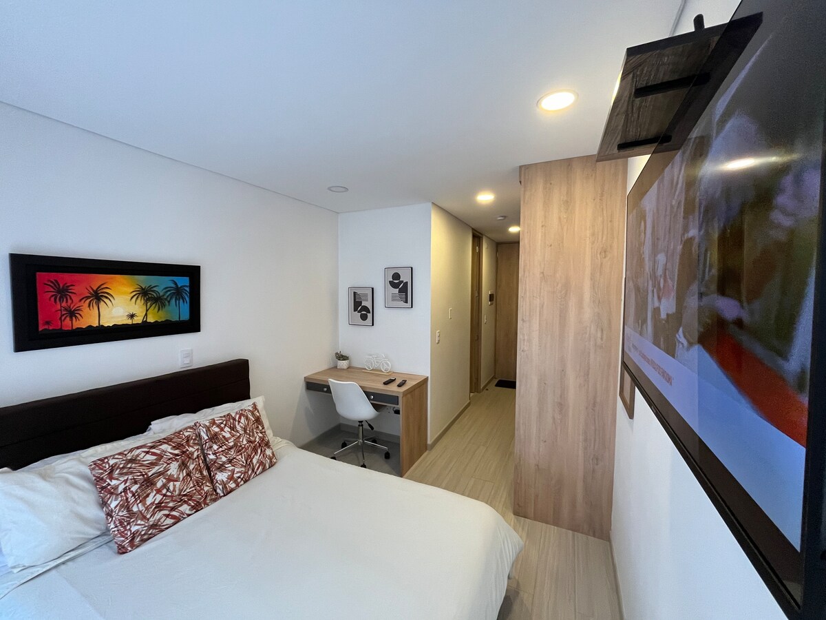 Located in the best area of Bogotá. ideal for business trips, leisure and small families that want to stay in a studio apartment. You will be in walking distance from three main shopping centers, top restaurants, gyms, supermarkets, bars, clubs, parks, coffe shops, hospitals and public trasnport stations in the city. This brand new studio apartament offers 24/7 doorman security a panoramic terrace on the building´s top floor, jacuzzi and front view to one of Bogota´s principal parks, el Virrey