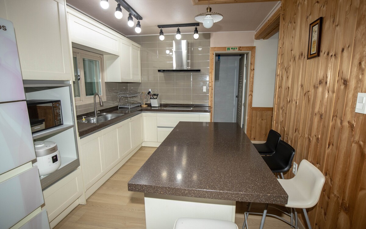 Mayo, el mes más cálido del año, En mayo, un espacio cálido solo para un equipo crea recuerdos preciosos :) ※ Información de uso - Descuento de 20.000 wones por noche para estadías de 2 noches o más - Aparcamiento disponible en las calles de los alrededores - Instalaciones de cocina al aire libre (parrilla eléctrica) - Azotea al aire libre (silla de camping, linterna, set de pícnic) - Altavoz Bluetooth Marshall - Barra de autoservicio (bagel, mermelada de arándanos, queso crema, fideos de arroz, salsa de soja, café en cápsulas, té Oshalrock) - Servicios individuales, se proporciona jabón de baño Himalaya Pink Salt (cepillo de dientes, pasta de dientes no incluida) - Proyector (YouTube, Netflix, transmisión por cable) / WiFi - Herramientas para juegos de Yut y varios juegos - Set de té (té de flores) ※ Información sobre reservas y tarifas Días laborables (domingo a jueves) 230.000 wones para 2 personas Fin de semana (viernes-sábado/festivos) 280,000 wones para 2 personas * Máximo 4 personas/persona adicional +20 000 KRW