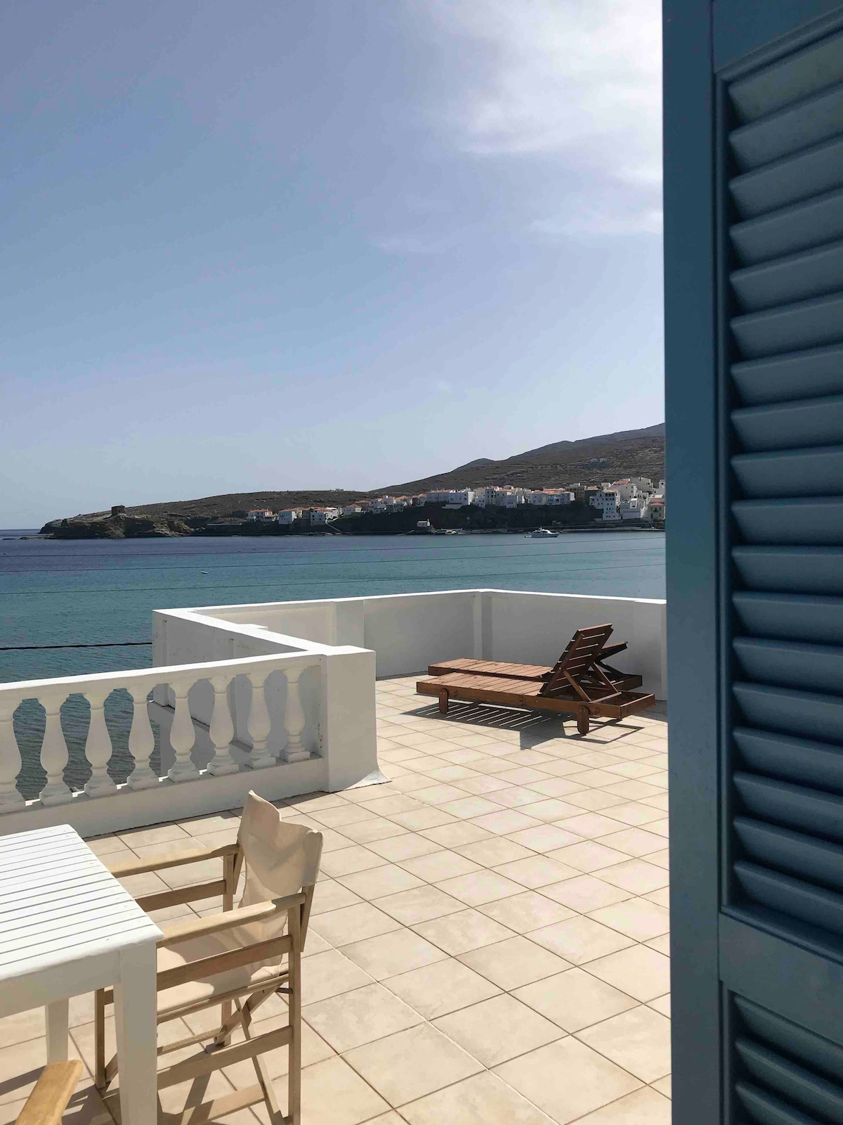 An excellent location for this cozy Greek style summer apartment on the top of Batsi bay, surrounded by the beautiful Aegean Sea. Spacious yard for enjoying the seafront and walking distance to the main market, Greek stores and restaurants. A 3-minute walk from the cute little beach of Kolones or the organized beach of Batsi bay. The apartment has a panoramic view of the sea and mountain with breathtaking sunrises. Accommodation in 2 rooms plus a spacious lounge and kitchen for preparing meals.