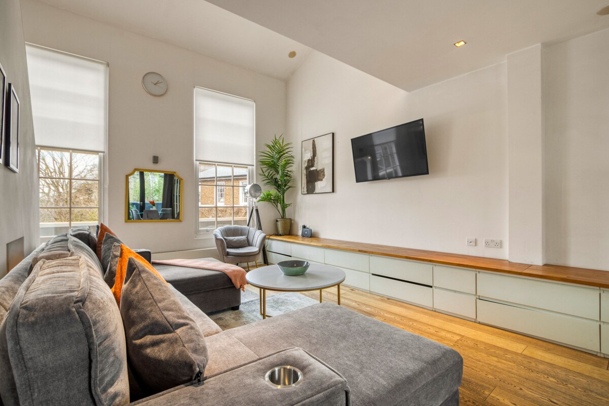 LA PROPIEDAD CURADA PRESENTA: Los techos de doble altura y las vigas a la vista crean un espacio habitable lleno de luz en este apartamento de un dormitorio. El apartamento tiene capacidad para 4 personas y ocupa todo el tercer piso de esta casa adosada georgiana de grado dos bellamente restaurada. El apartamento ha sido reformado con cariño por un diseñador de interiores, y la atención al detalle es evidente en todas partes, con muebles elegantes y toques contemporáneos que proporcionan un encantador hogar temporal para los huéspedes.