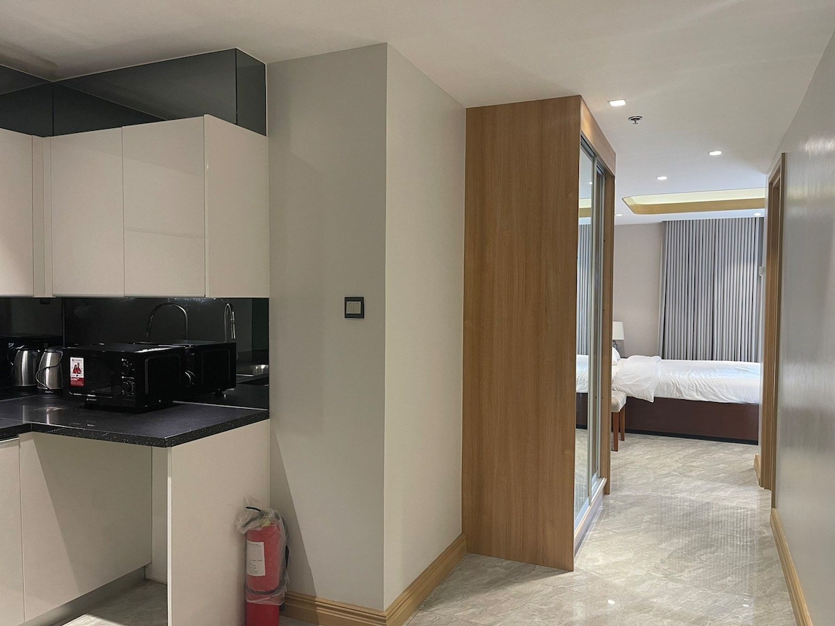 Este estudio especial del 8º piso de Kandi Palace tiene una vista panorámica única desde el gran balcón. Supermercado (JJs abierto las 24 horas) a solo 3 minutos, la cafetería está en el vestíbulo y la azotea, la lavandería y la estación de recarga de agua se encuentran en la misma calle. Estudio tranquilo en el✅ octavo piso ✅️ Espacio de trabajo dedicado Llegada y salida✅️ fáciles las 24 horas TV de pantalla plana✅ grande con Netflix ✅ Guardias las 24 horas ✅ Wi-Fi ✅ Cocina con electrodomésticos básicos ✅ Café restaurante en el vestíbulo y piscina en la azotea Acceso ✅️ al gimnasio ✅ Estacionamiento