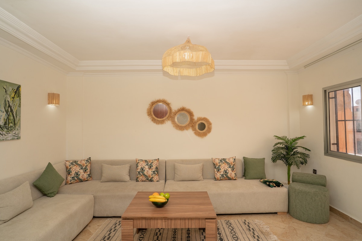 Escápese a esta hermosa villa en Marrakech: 4 dormitorios, 3 salones, sala de cine 🎬 + sala de fitness solo para usted. Piscina privada climatizada 🏊♀️+ acceso a una piscina comunitaria. Descanse en el jardín aromático🌿 y disfrute de las vistas sublimes del Atlas🌄 desde su terraza. Le ofrecemos un cóctel refrescante 🍹🍶una cesta de frutas frescas y de temporada🍉. 🚕A 10 minutos en auto de la famosa medina y a 15 minutos de los jardines Majorelle. 💂♀️Residencia vigilada las 24 horas del día.