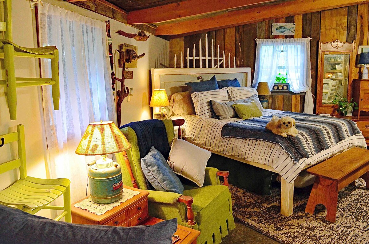 The TinyBarn at Covenant Woodlands is a lofted 350 sq ft glamping cottage in the piney woods of AL. Made with love from locally reclaimed upcycled materials. Equipped with modern appliances that fit the nostalgic cabin vibe: an electric wood burning stove and red retro kitchen appliances complimented by bear & moose accent decor. It’s cozy, but with everything you need for a getaway. Outside you’ll find rockers, a fire pit/outdoor dining area plus a hammock and bench. Insta: @CWglampingInAL