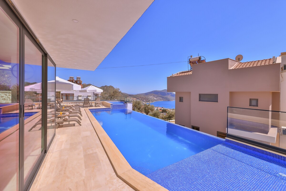 Villa Pax se encuentra en la región de Kalkan, una zona de belleza única de Antalya, la capital turística de nuestro país. Nuestra villa, que se encuentra en la bahía de Kalamar, que también tiene un lugar especial en la región de Kalkan, tiene 7 dormitorios y puede alojar cómodamente a 14 personas. En esta villa, como en algunas de nuestras otras villas, todas las habitaciones tienen vistas al mar único de Kalkan. Además de esta vista, también cuenta con una piscina infinita privada y decorativa para sus huéspedes.