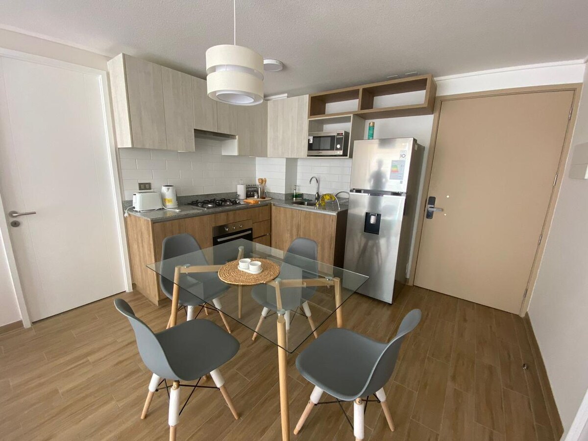 Hermoso departamento diario 1D 1B /piso 12 - 1 Habitacion matrominial cama king ( se puede separar en camas individuales) -1 baño en suite -Cocina Equipada -Wifi y Cable. -Balcon con vista al mar. cuenta con malla de seguridad. -Estacionamiento privado. -Espacios comunes como piscina, gimnasio, sala de trabajo, salas de diversion. - Alrededores cuenta con supermercado, bencinera, mall portada norte - A 20 minutos de Aeropuerto Andres Sabella y EXPONOR -Chek in flexible -No se admiten mascotas