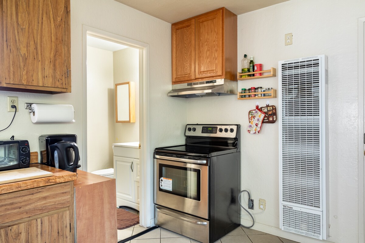 Nicely remodeled designer private studio unit. High speed internet 1200 Mbps and 4K Roku-enabled TV Separate external key-code entrance. Separate heating and air conditioning control, handheld remote. Desk area. Spotless attached bathroom. Cathedral wooden ceiling. Super comfortable queen bed, comforter, padded headboard. Zoned, dimmable lighting. Small kitchenette area with counter, microwave, refrigerator, sink, utensils. Friendly, responsive hosts.