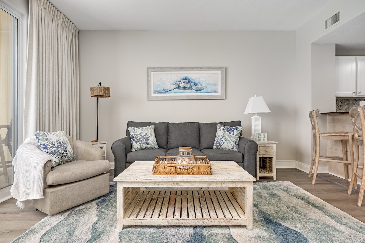 Welcome to Sterling Breeze 2107, lovingly called Breezy-Living! - Beautifully remodeled 2 bedroom, 2 bath condo - Oceanfront Master bedroom with renovated bathroom - Private grill on balcony - Beach chair service plus beach closet stocked with chairs, umbrellas and toys - Heated resort pool, hot tub and Tiki bar serving food and drinks - Short 1/2 mile walk to Pier Park - Custom hallway built-in featuring whale hooks. - Each bunk features dimmable light and outlet with USB charging
