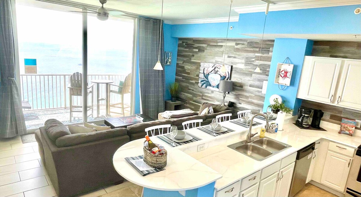 Oceanfront condo with panoramic Gulf views from the terrace, primary bedroom, and living room. Sleeps 6. 2BR + bonus room with 2 twins (no closet), 2BA. Kitchen remodel Jan 2025 (pics soon). 2024 guest bath with double sinks, 2022 primary spa bath with tiled walk-in shower. 10-min walk to Pier Park. HE washer/dryer, private WiFi, 70" Smart TV with Hulu, Smart TVs in all bedrooms. Must be 25+; ID may be required. ** Not seeing dates that work for you? Check out airbnb.com/h/nautical-nonsense9