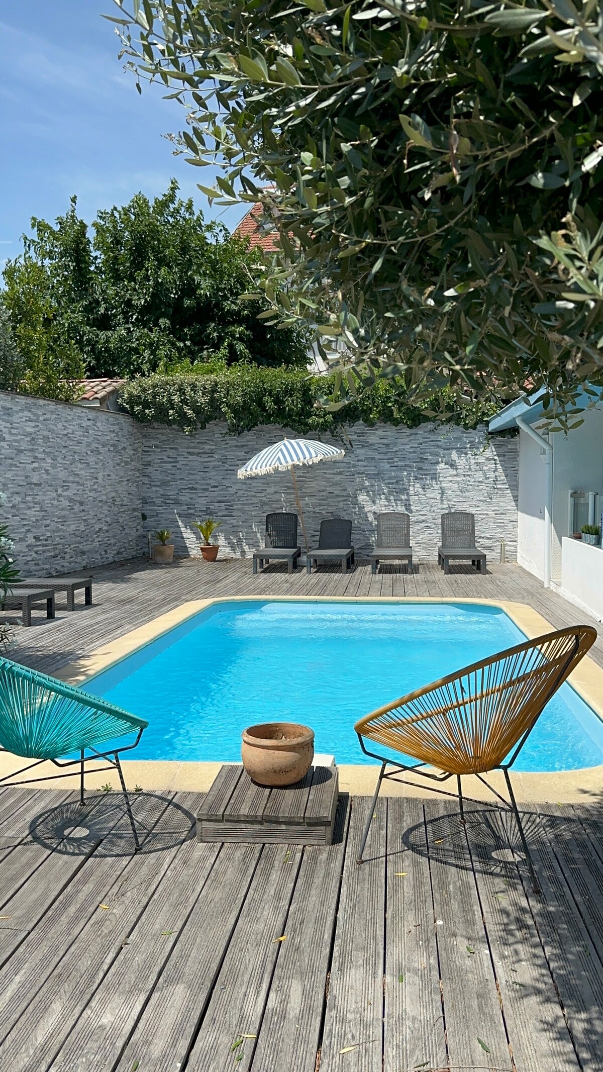 Casa entera 6 viajeros 3 dormitorios - 5 camas - 2 baños - piscina privada - varias terrazas - estacionamiento (cargador eléctrico). “Cabaña” en el puerto de La Teste. A 10 minutos de las playas y la duna de Pilat. Auténtico distrito de cultivo de ostras. Estación de tren a 400 metros de distancia. Atípico para la comodidad proporcionada por la madera, sus terrazas, su entorno acuático (entre el puerto y el 'canelot'), sus vistas, su piscina y las ostras del vecino, las mejores de la cuenca. Esta es mi casa personal.