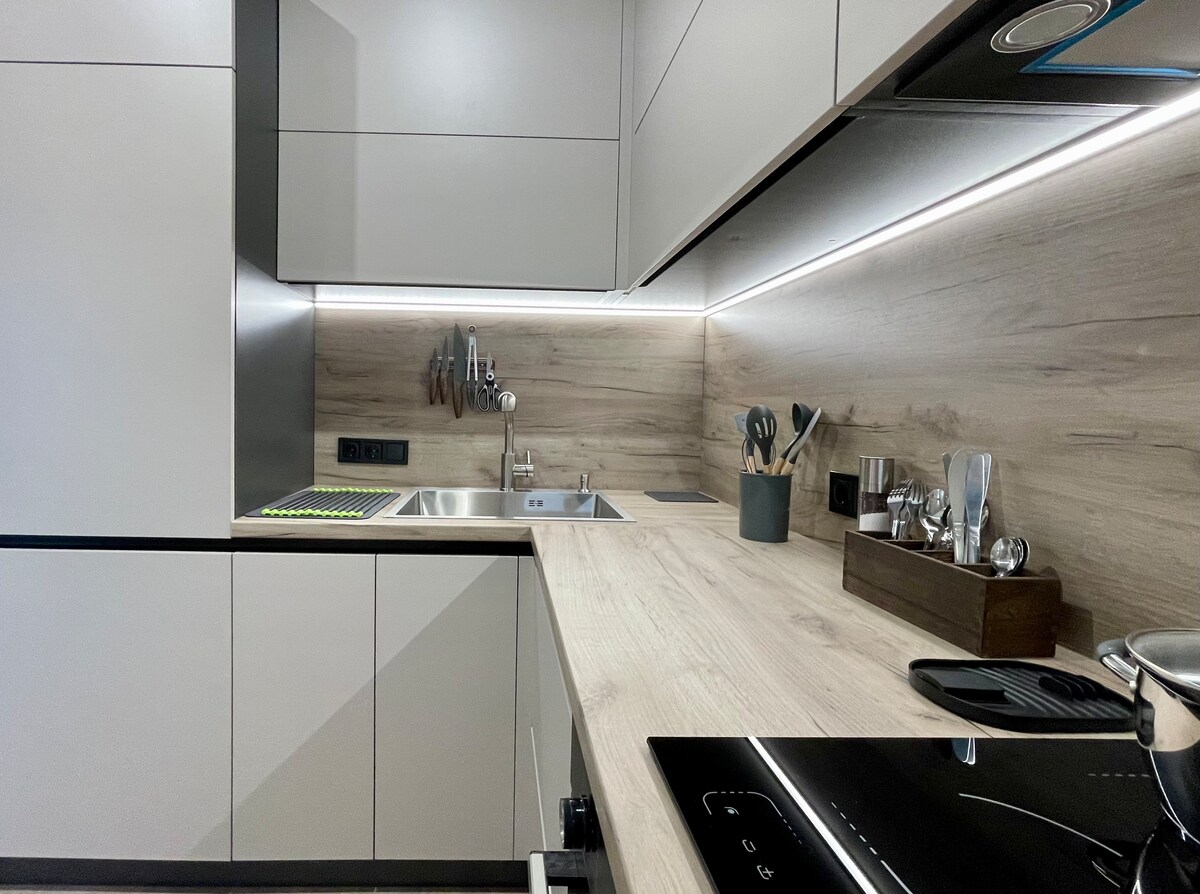 A very stylish designer apartment with an amazing city and sea view that can be enjoyed from the open terrace. Equipped with modern technology and good quality furniture. 20 minutes walk from the beach. For those with good taste and appreciation for nice things. Стильна квартира з дизайнерським ремонтом з чудовим видом на місто та море. Оснащена сучасною технікою та якісними меблями. 20 хвилин пішки до пляжу. Для тих, хто має гарний смак та цінує красиві речі.