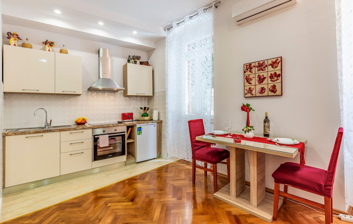 La propiedad consta de cocina totalmente equipada, dormitorio, baño con ducha, aire acondicionado, wifi gratuito, televisión inteligente, NETFLIX y balcón con vistas al Arco Triunfal. ¡Es perfecta para salir a comer o simplemente tomar una copa de vino por la noche! El mercado está a pocos minutos a pie y tiene una increíble cantidad de pescado fresco, carne y verduras. El puerto y la estación de autobuses están a pocos minutos a pie.