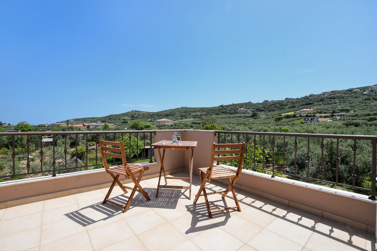 Nuestra villa, parte de CretanRetreat, ofrece bella vista en zona tranquila, perfecta para familias, parejas y exploradores. 98 m², 25 min de Heraclión, 15 min de Cnosos, 30 min del aeropuerto. ‣ 3 dormitorios ‣ 2 baños ‣ 2 camas Queen ‣ 4 balcones ‣ Jardín ‣ Estacionamiento en el lugar ✭“Uno de los mejores Airbnb en los que hemos estado! Gran ubicación con vistas preciosas,muy tranquila, rodeada de olivos. La villa tiene carácter y es ideal para visitar Knossos y Heraclión.”